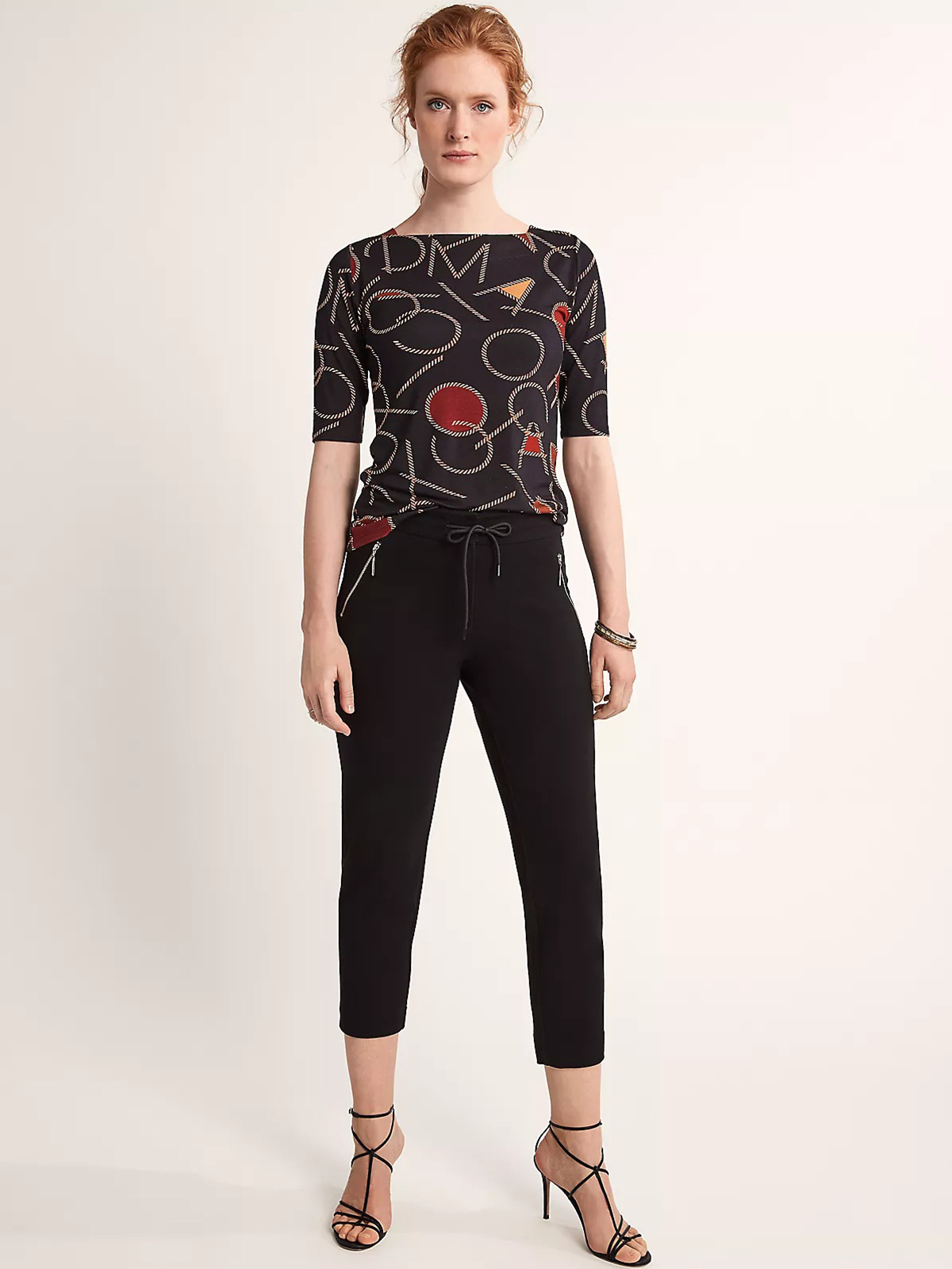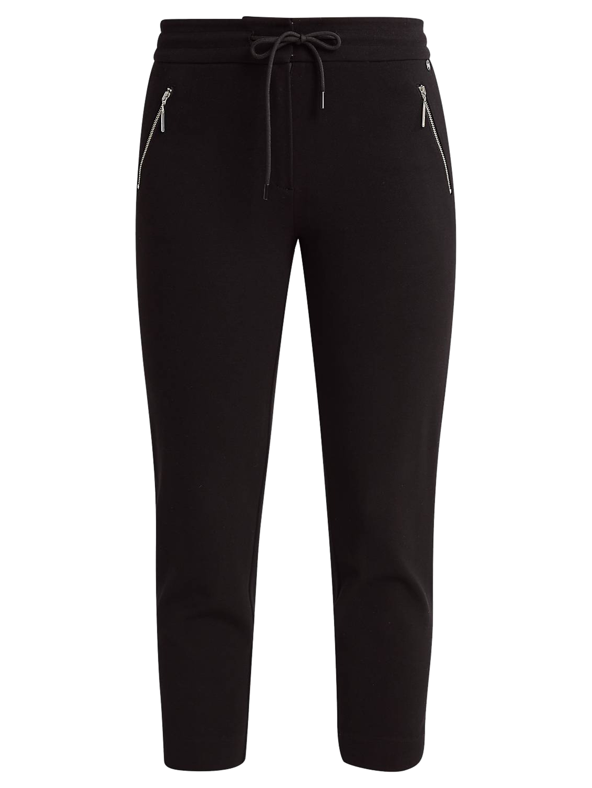 Укороченные однотонные брюки силуэта slim. Комфортная высокая посадка, притачной пояс с кулиской, застежка на скрытую молнию. Боковые косые карманы на молнии.