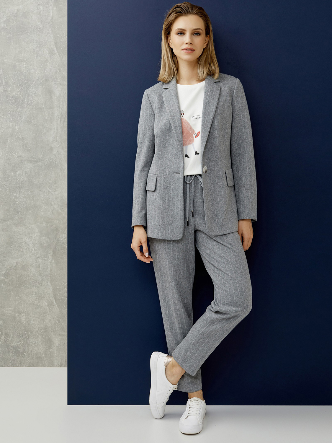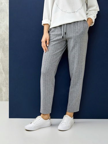 Однотонные серые брюки прямого кроя в полоску. Эластичный пояс с кулиской обеспечивают комфортную посадку и удобство ношения. Брюки – идеальный вариант низа для повседневного образа, сочетаются как с футболкой или джемпером, так и с жакетом в тон.