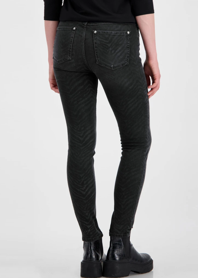 Зауженные джинсы в анималистичном дизайне. Принт зебра по всей поверхности. Передние прорезные карманы украшены декоративной лентой. Накладные задние карманы. Брюки застегиваются на пуговицу и потайную молнию.