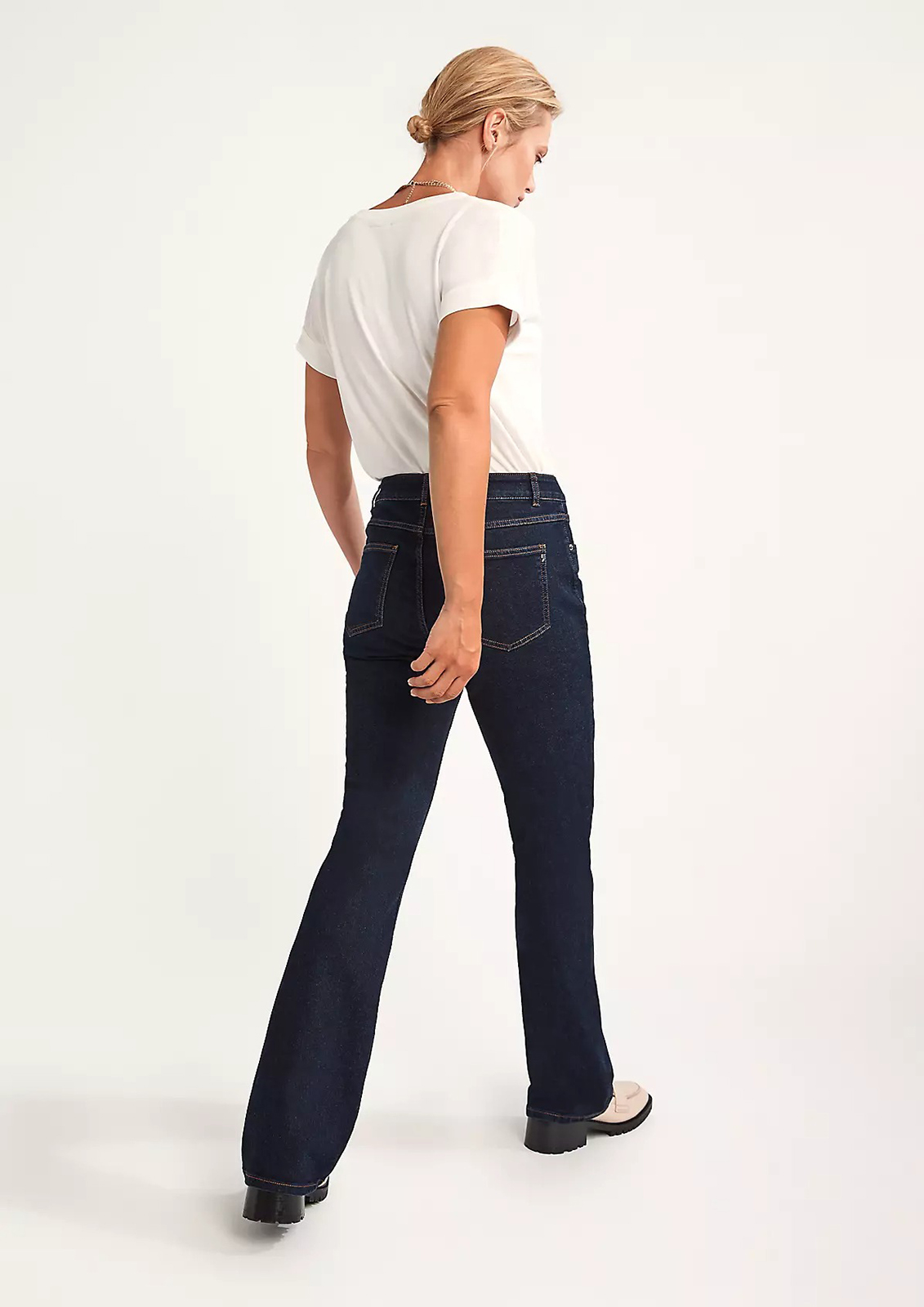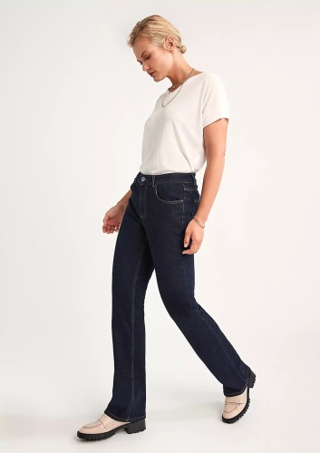 Темные однотонные джинсы-клеш с высокой посадкой. Без декоративных потертостей и складок. Классические пять карманов, притачной пояс со шлевками. Трендовая модель джинсов для создания актуального образа! Хорошо сочетаются с заправленной рубашкой или джемпером.