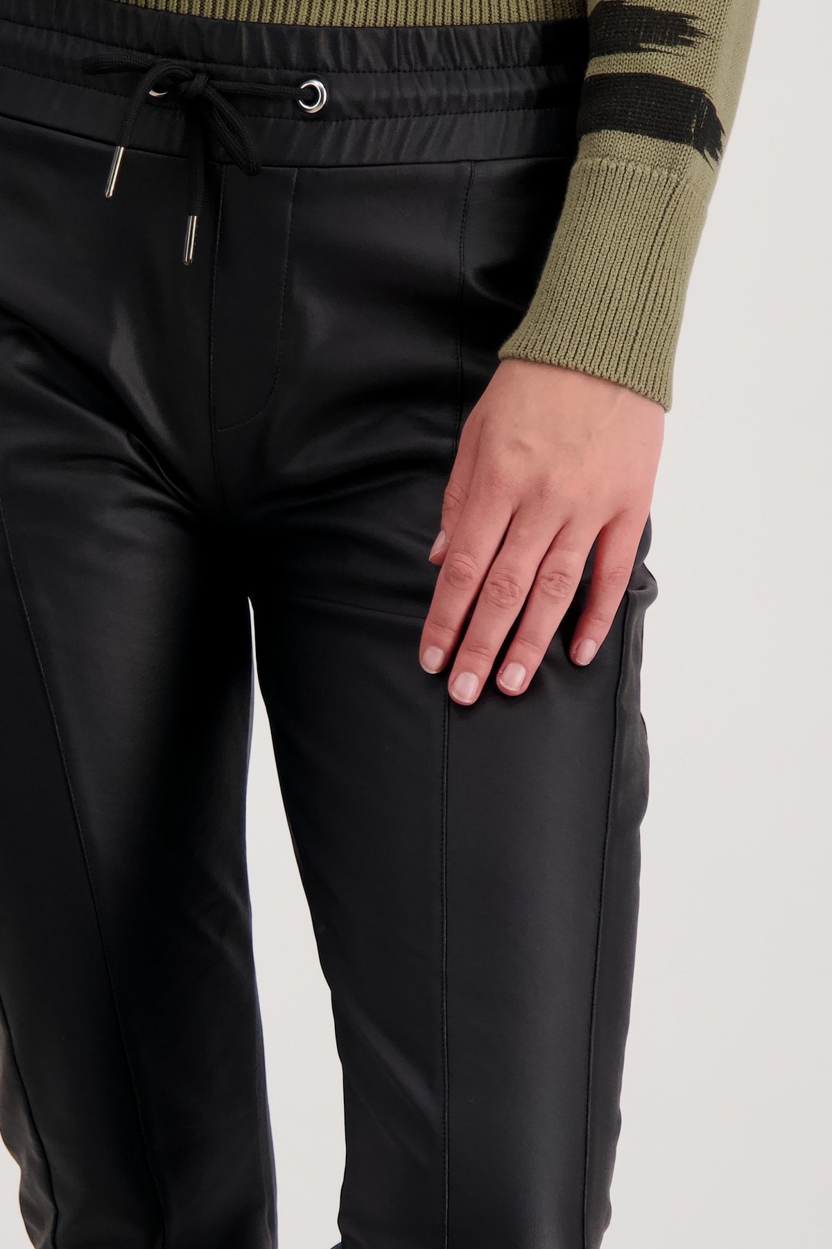 На сайте указны российские размеры. Джоггеры monari из кожи с галстуком. Модель имеет особую изюминку за счет продольных разделительных швов спереди и сзади. Эластичный пояс с петлями для ремня, кулиской с проушинами и завязками для завязывания, а боковые швы с незаметной молнией и два ложных прорезных кармана на спине завершают образ. Рост модели 179 см Длина по внутреннему шву 74 см.