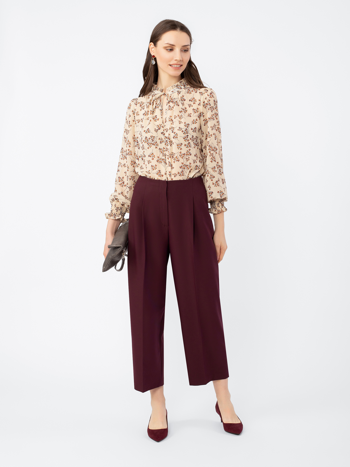 Брюки свободного кроя, длина 7/8. Высокая посадка. Спереди глубокие складки. Застежка на молнию и крючок. Боковые карманы рабочие.