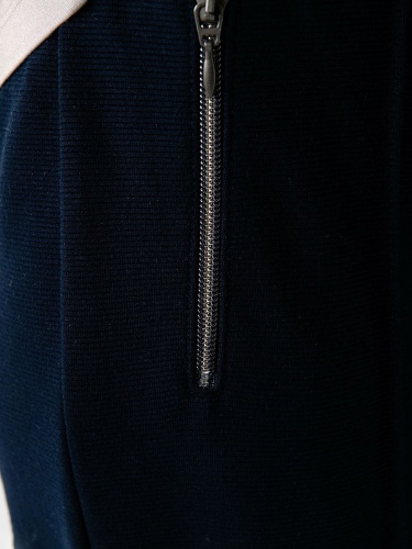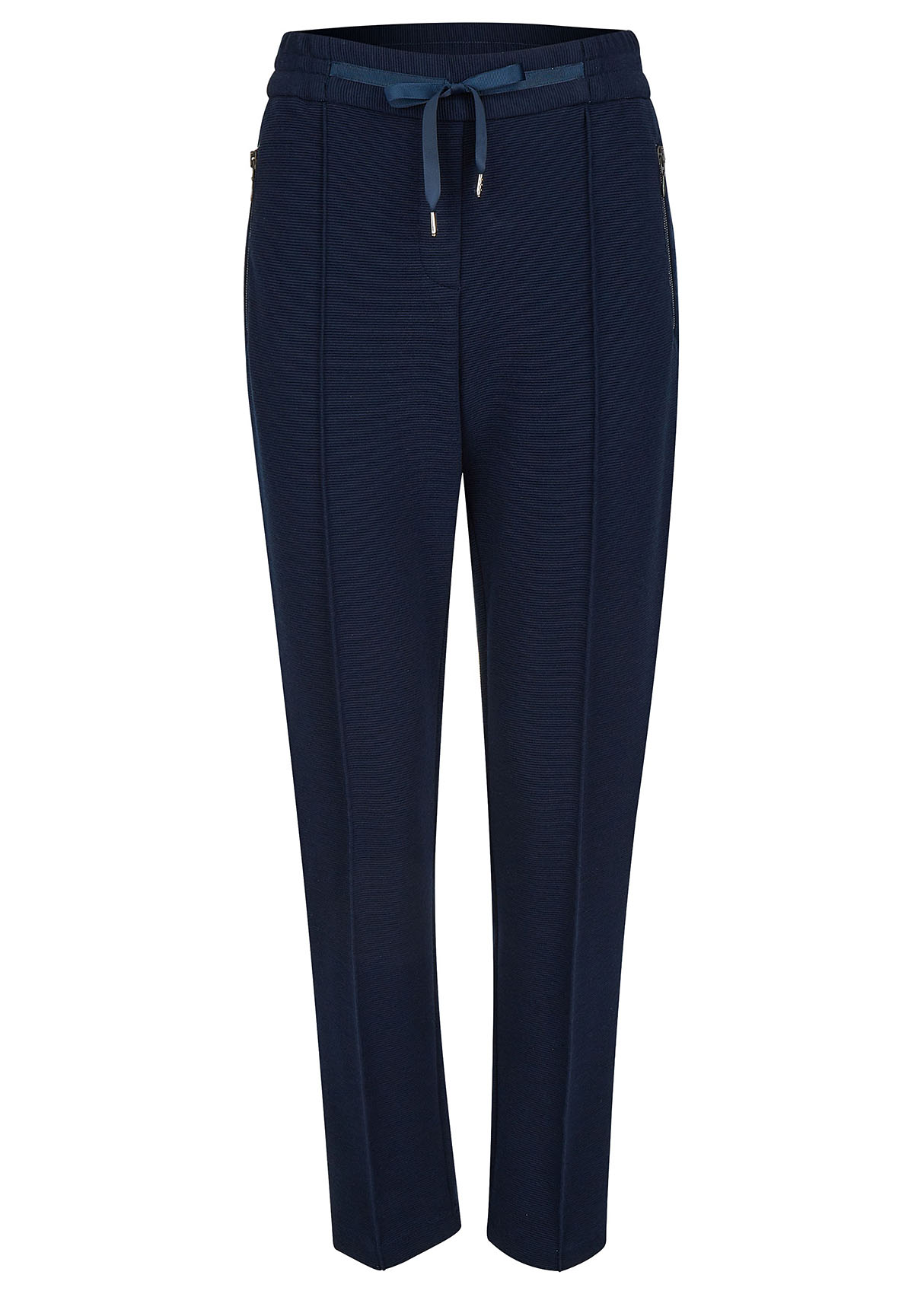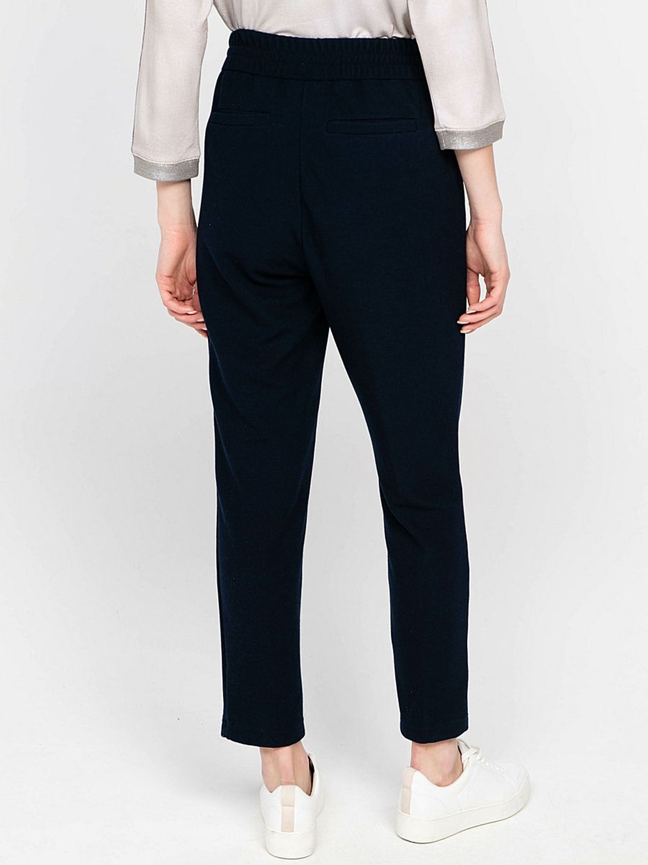 Темно-синие прямые брюки с продольной строчкой задают серьезный тон. Элегантная деталь - атласная лента на поясе. Материал из смеси полиэстера, вискозы и эластана приятен к телу и легок в уходе. Брюки отлично сочетаются с блузками и футболками, а с кроссовками у вас получится современный демократичный образ.