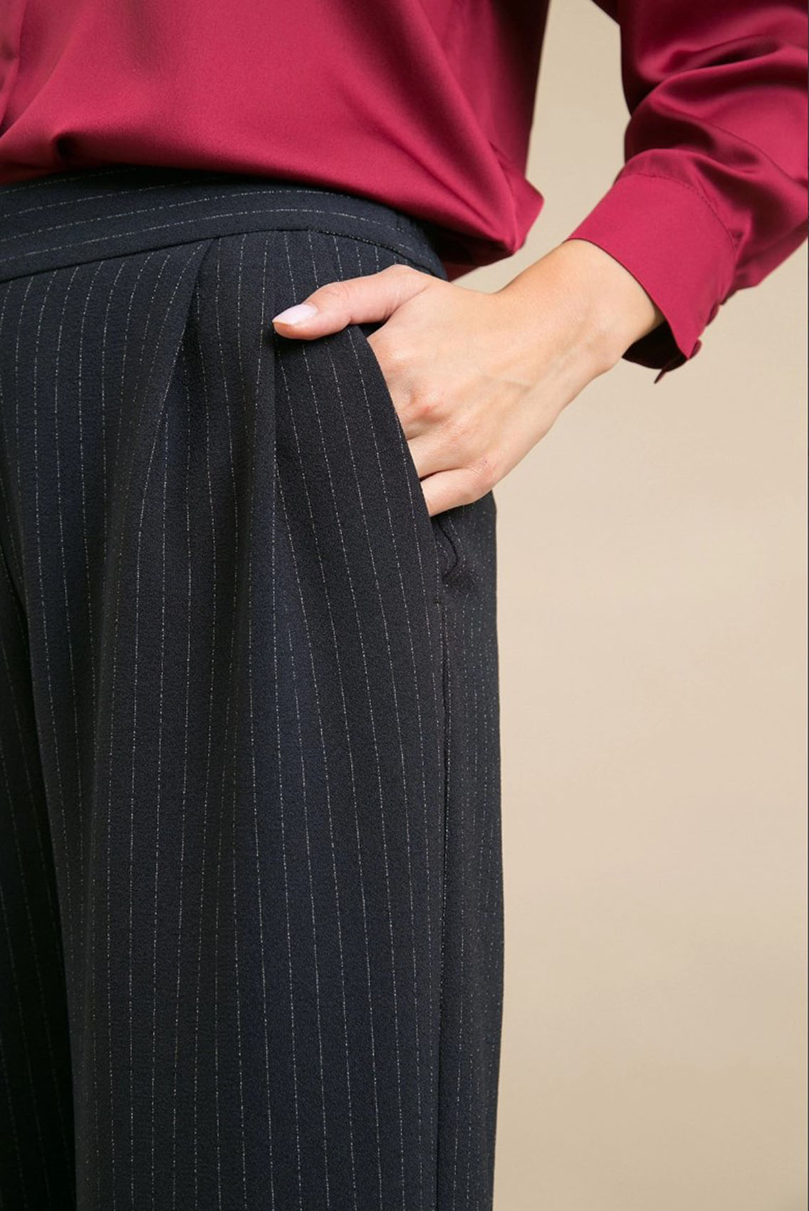 Темно-синие брюки в полоску. Модель свободного кроя, имеет высокую посадку, притачной пояс, боковые вертикальные карманы. Спереди расположен гульфик классической формы, застегивается на потайную молнию и пуговицу. У карманов штанины драпированы складками. Элегантная модель для создания делового образа.