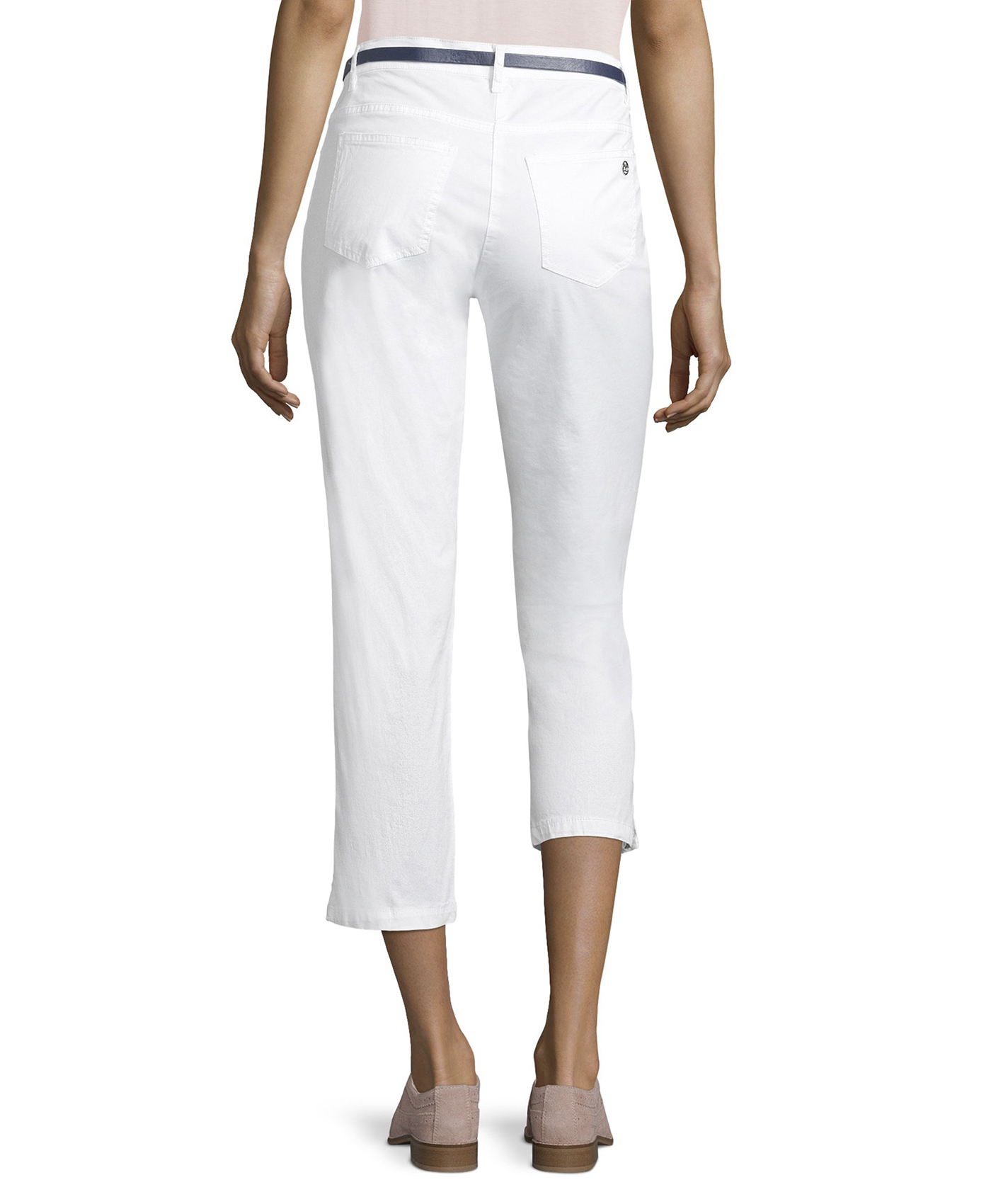 Укороченные брюки слегка расклешенного кроя обращают на себя внимание. Универсальная средняя посадка. Небольшие разрезы снизу по боковым швам. Приятный к телу материал из хлопковой смеси обеспечивает комфорт в ношении. В сочетании как с футболкой, так и с блузой эти брюки создают стильный современный образ.