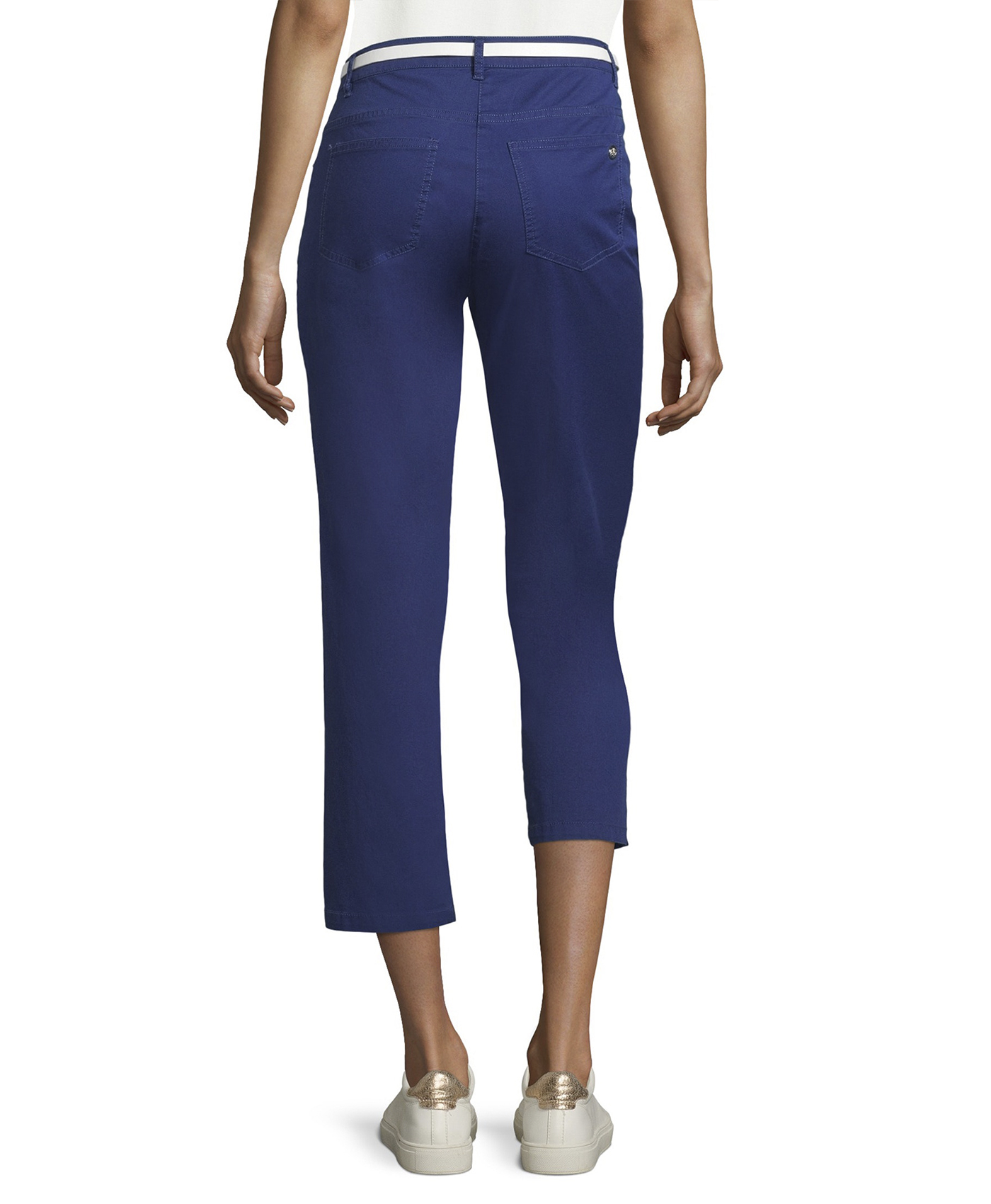 Укороченные брюки слегка расклешенного кроя обращают на себя внимание. Универсальная средняя посадка. Небольшие разрезы снизу по боковым швам. Приятный к телу материал из хлопковой смеси обеспечивает комфорт в ношении. В сочетании как с футболкой, так и с блузой эти брюки создают стильный современный образ.