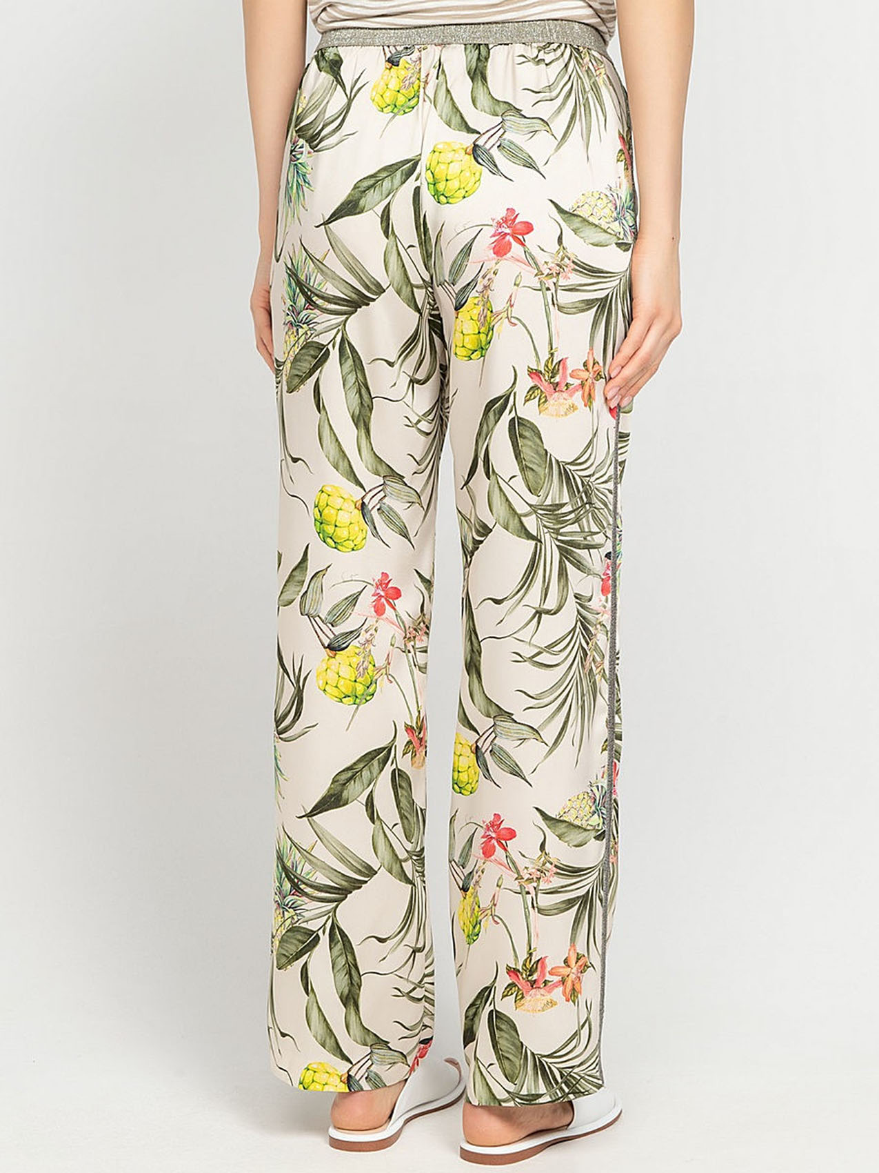 Широкие прямые брюки с трендовым тропическим принтом. Модный свободный силуэт. Эластичная лента на поясе. Без карманов. Декоративная лента по бокам. Приятный к телу материал из смеси хлопка и эластана.