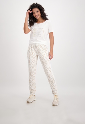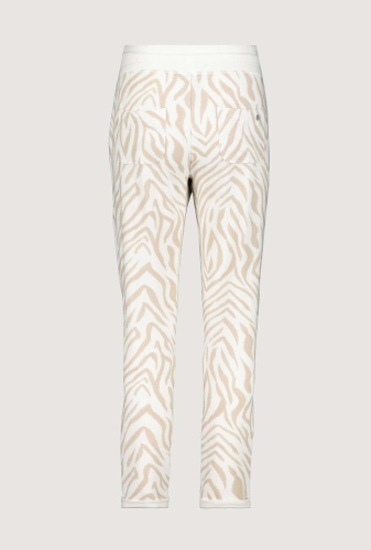 На сайте указаны Российские размеры. Спортивные джоггеры Monari с животным принтом. Сплошной рисунок под зебру дополняется однотонным поясом с блестящими оверлочными швами, однотонной тканевой вставкой с блестящими оверлочными швами по бокам и подвернутыми однотонными штанинами. Боковые карманы и накладные карманы на ягодицах завершают вид спортивных штанов с нормальной посадкой. Параметры модели: 42 размер, рост 179 см
