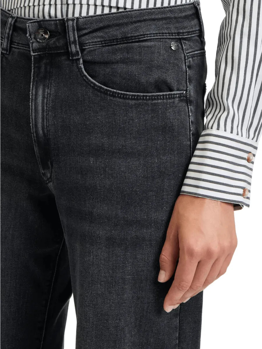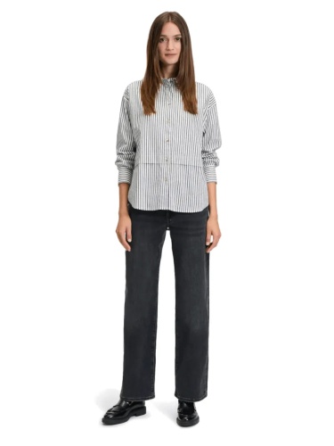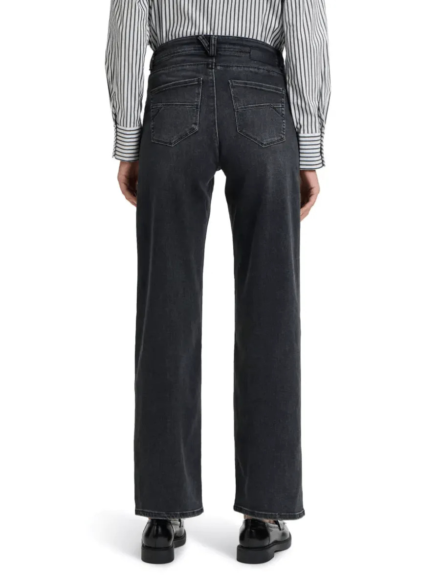 Элегантные темные джинсы с широким силуэтом, выполненные из мягкого денима, обеспечивают комфорт и универсальность, идеально сочетаясь с рубашками и свитерами для создания стильных образов.