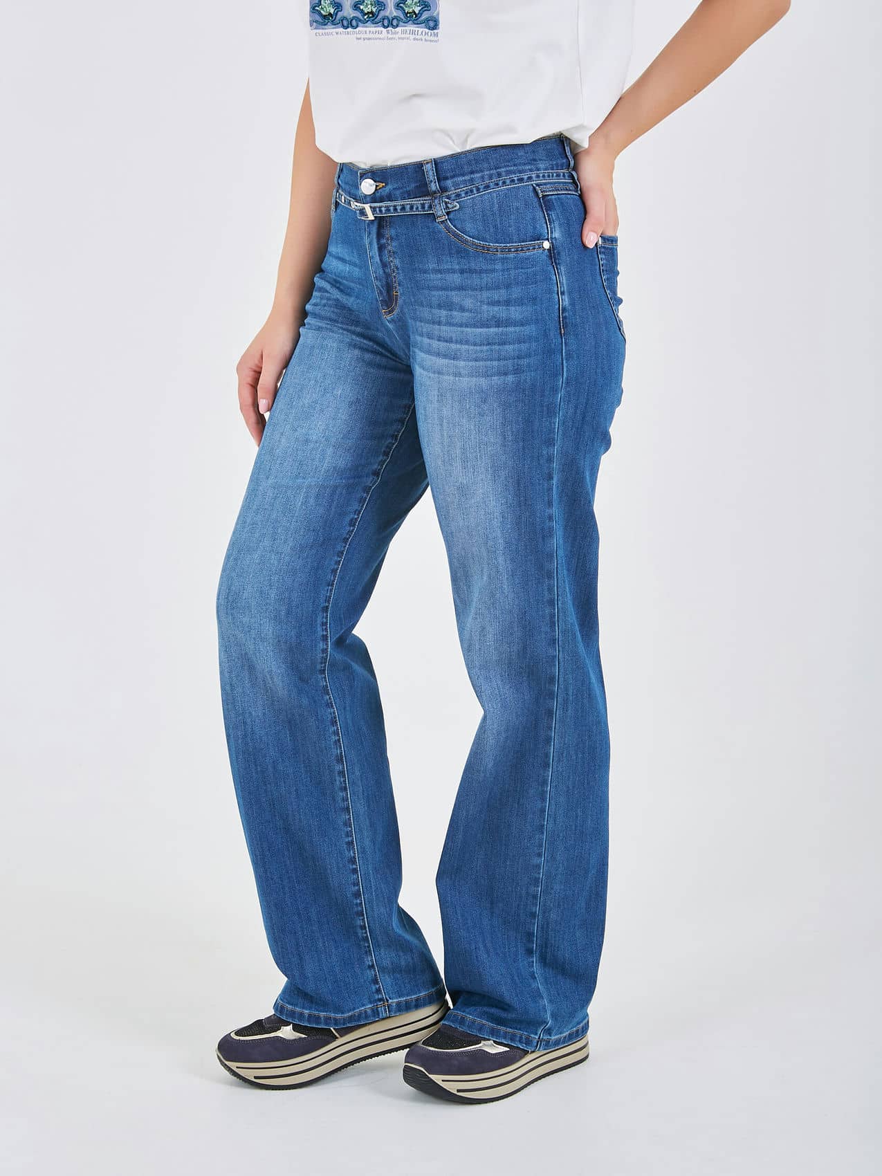 Джинсы прямого кроя на средней посадке с акцентным декоративным ремнем спереди. Коллекция Весна-Лето 2025-2026. Капсула "Сен-Тропе". Параметры модели: 95-64-101, рост 175, размер 44-46