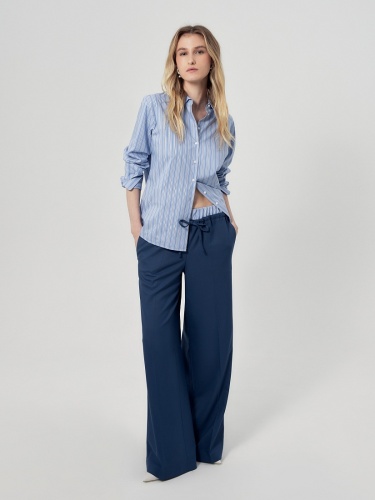 Широкие брюки на резинке и кулисе из костюмной ткани темно-синего цвета. Составит идеальный комплект с укорочённым жилетом из одной ткани.