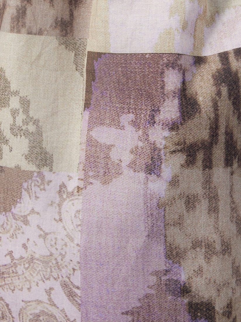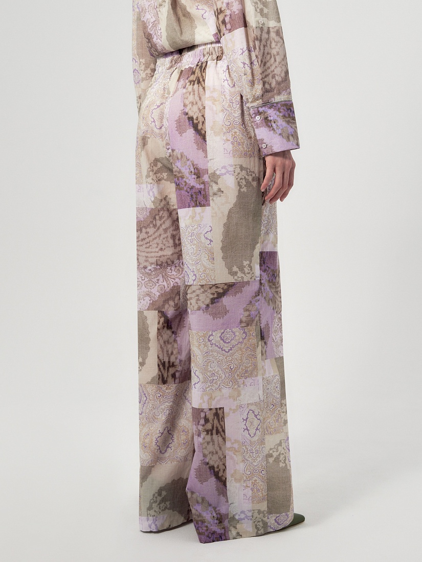 Брюки полной длины, из тонкой хлопковой ткани с этническим принтом в технике пэчворк, свободной формы, на поясе. В пояс вставлена резинка и кулиcка для лучшей фиксации.