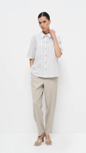 Брюки О-образного силуэта длиной 9/10 выполнены из летней вискозы со спандексом, обеспечивающим абсолютный комфорт за счет высокой эластичности. Цвет «белый сандал» придает изделию свежесть и легкость. Дополнительный съемный пояс со смещенной линией застежки добавляет изделию оригинальности, пуговицы на нем расположены в динамичном порядке, придавая брюкам уникальный стильный вид.