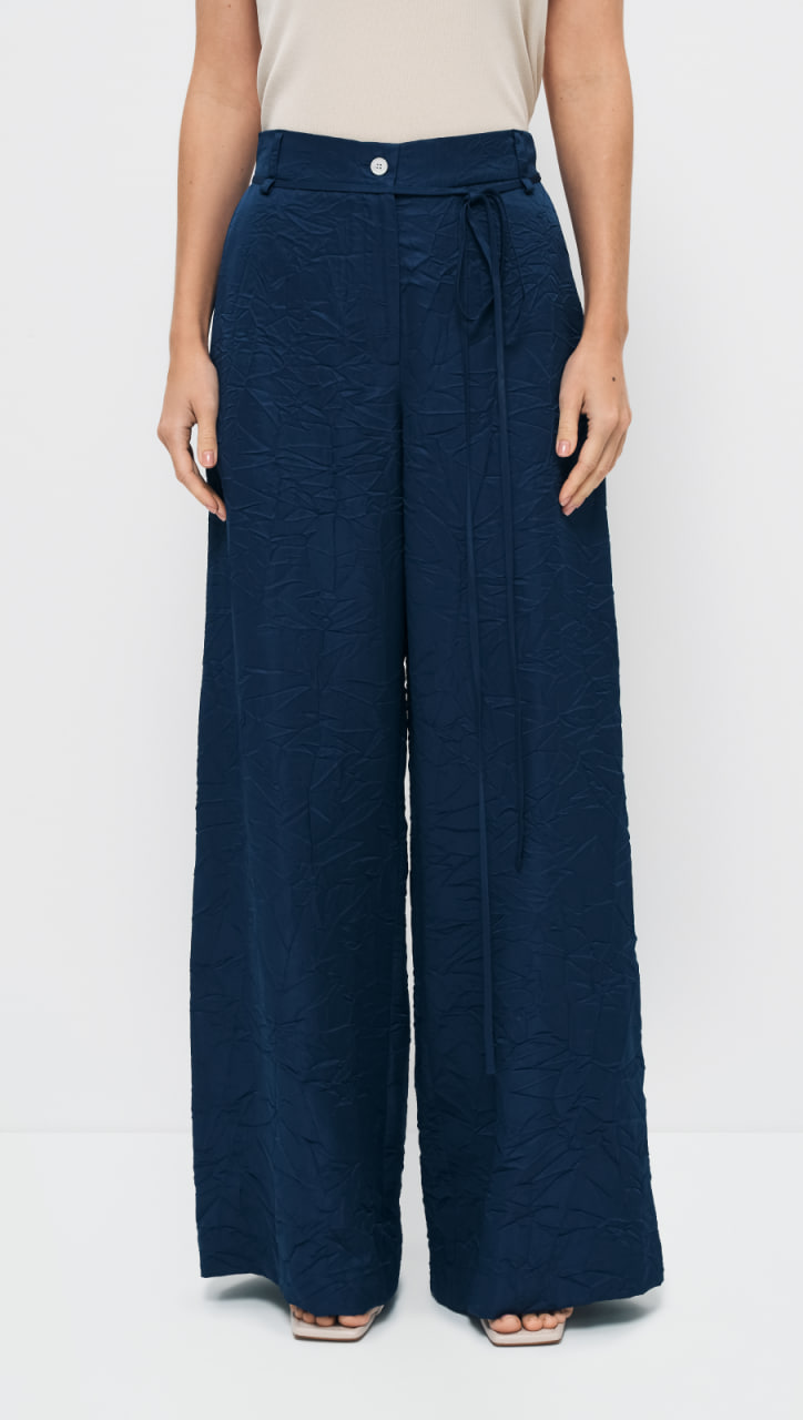 Брюки полной длины выполнены из приятной на ощупь вискозы с мятым эффектом в цвете «полночный синий». Силуэт прямой, свободный. Притачной пояс с эластичной тесьмой в задней части обеспечивает идеальную посадку, подчеркивая фигуру.