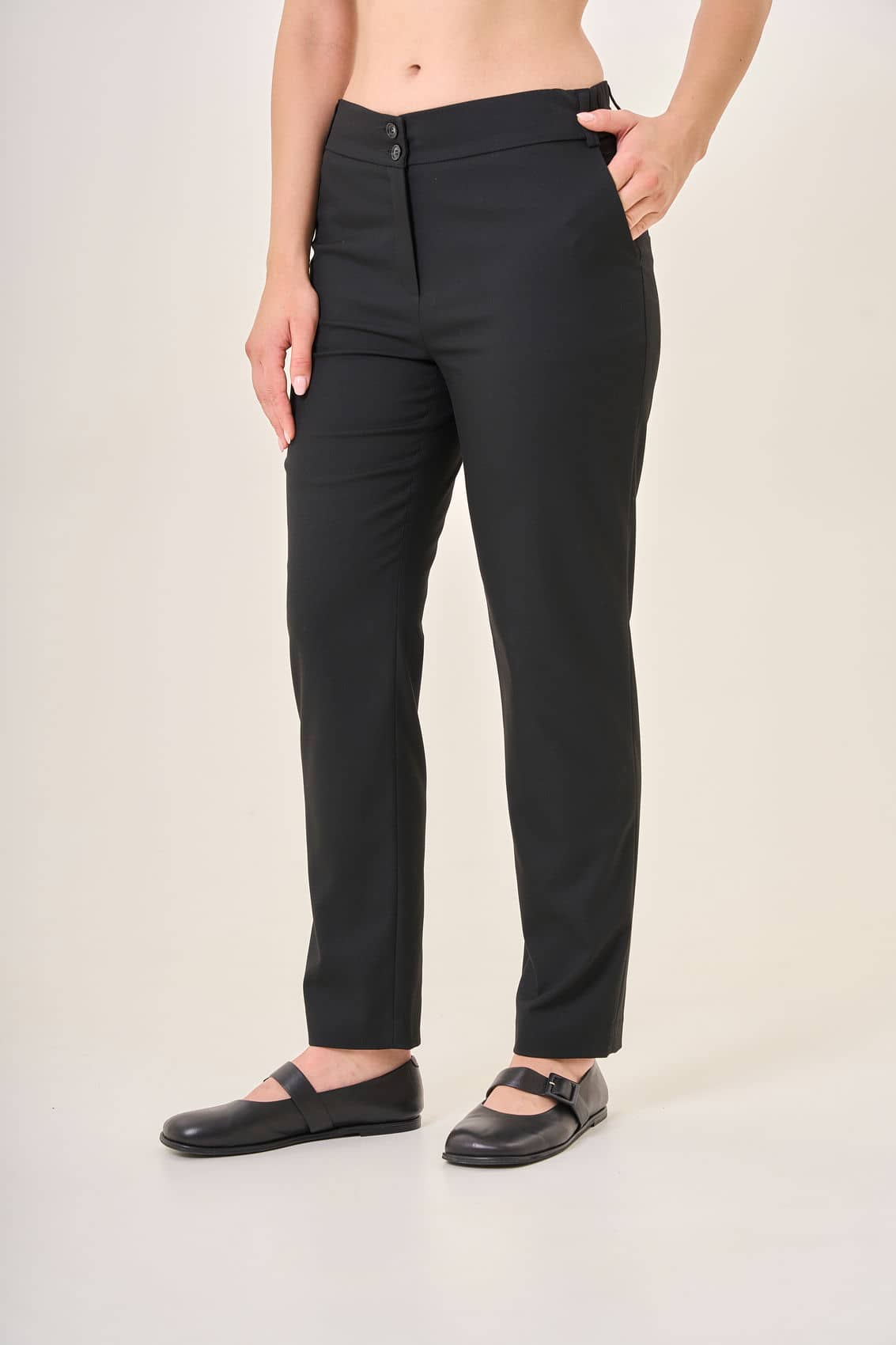 Женские классические брюки, слегка зауженные книзу. Комфортная посадка на талии и элегантный крой идеально подходят для офисного и повседневного гардероба. Сзади расположены два аккуратных накладных кармана, подчёркивающие классическую стилистику изделия. Плотная ткань сохраняет форму и выглядит презентабельно на любой фигуре.