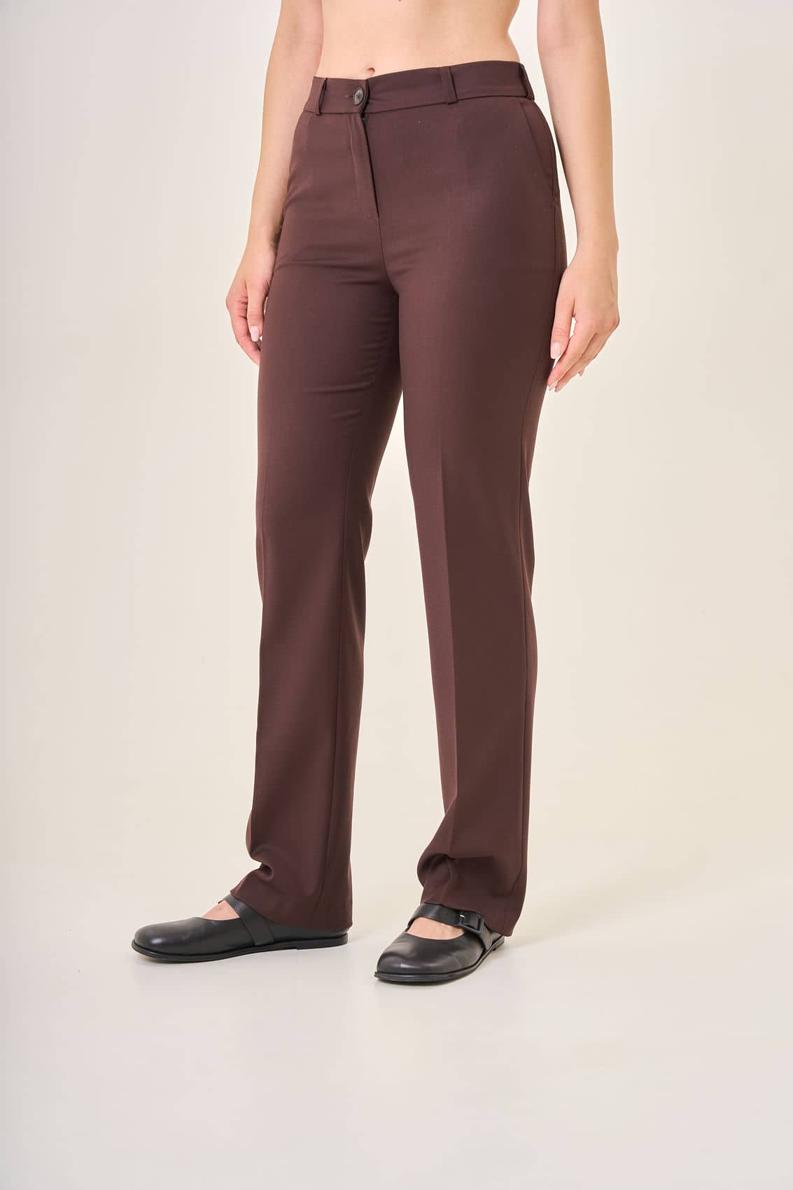Брюки классического кроя. Высокая посадка талии обеспечивает максимальный комфорт и поддержку, подчеркивая тонкость фигуры. Прямая штанина создает лаконичный и элегантный силуэт, подходящий для любых ситуаций. Удобная застежка на молнию и пуговицу добавляют практичности и эстетики внешнему виду. Эти брюки отлично подходят для женщин всех типов фигур, визуально вытягивая силуэт и подчеркивая природную красоту. Осень-Зима'25/26. Капсула "Вино из одуванчиков"