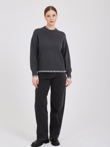Женский темно-серый свитер свободного кроя. Длинные рукава и круглый вырез подчеркивают элегантность образа. Горизонтальные белые полосы на нижней части изделия и манжетах создают стильный акцент. Натуральный высококачественный материал приятен к телу и идеально подходит для прохладной погоды. Осень-Зима'25/26. Капсула "Вишневый сад"