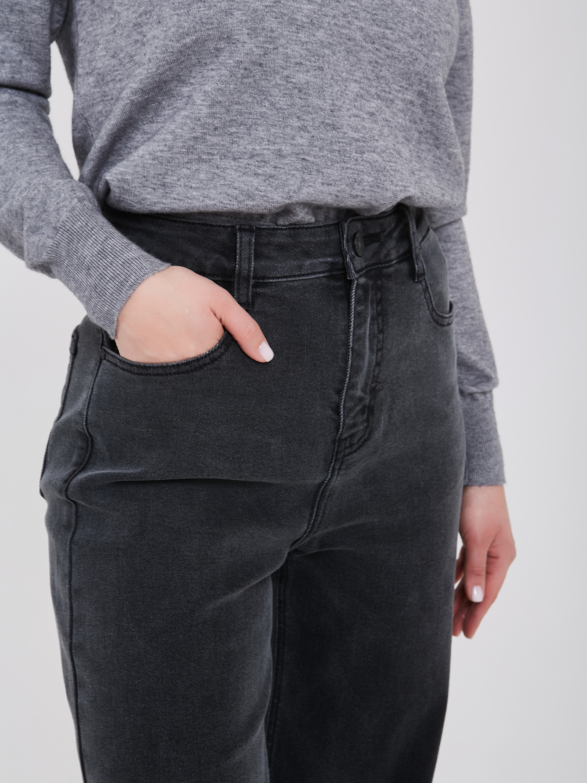 Серые джинсы на высокой посадке с прямым кроем, расширяющимся от бедра до низа. Эта базовая модель выполнена из качественного плотного денима, подходящего для осенне-зимнего сезона. Джинсы удобно сидят на любой фигуре, формируя идеальный силуэт и обеспечивая свободную посадку. Стильный и универсальный элемент гардероба, способный подчеркнуть индивидуальность своего владельца. Осень-Зима'25/26. Капсула "Вишневый сад"