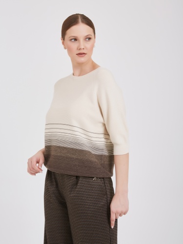 Женский кремовый джемпер свободного покроя. Рукава длиной три четверти и круглый вырез формируют изящный силуэт. Нижняя часть изделия украшена горизонтальными полосами, плавно переходящими от светлых тонов к насыщенным оттенкам коричневого, создавая динамичный визуальный эффект. Мягкий качественный материал обеспечивает комфорт и уют в любую погоду.Осень-Зима'25/26. Капсула "Вино из одуванчиков"