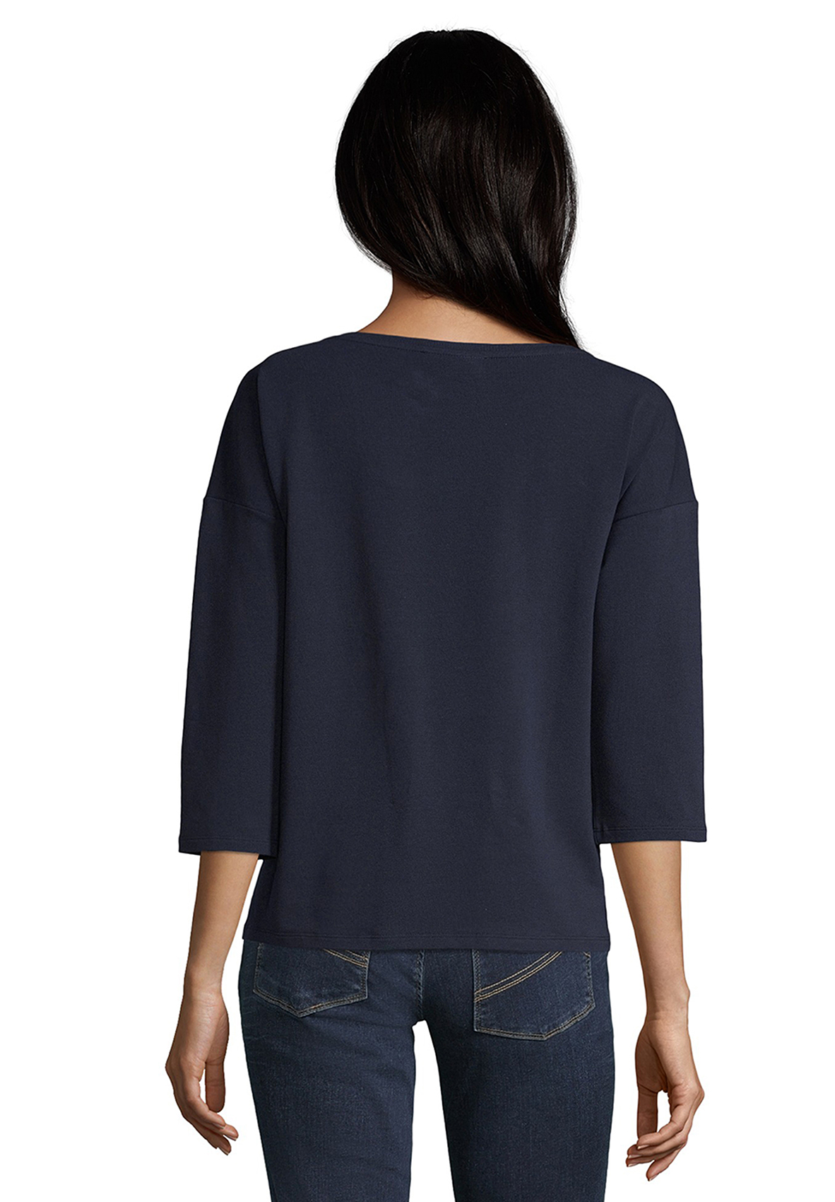 Джемпер с металлизированным принтом - яркий акцент вашего образа. Комфортный прямой покрой, горловины-лодочка, рукава 3/4 со спущенным плечом. Отделка горловины и рукавов с нитью люрекса придает роскошный блеск. Приятный эластичный материал из смеси хлопка и модала.
