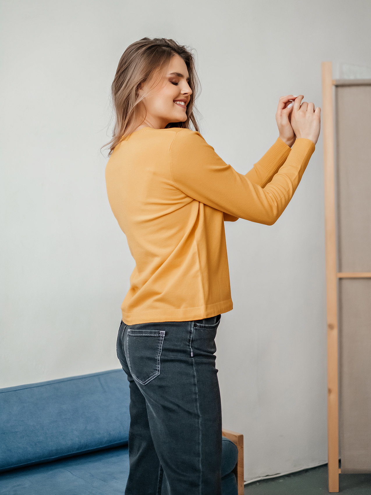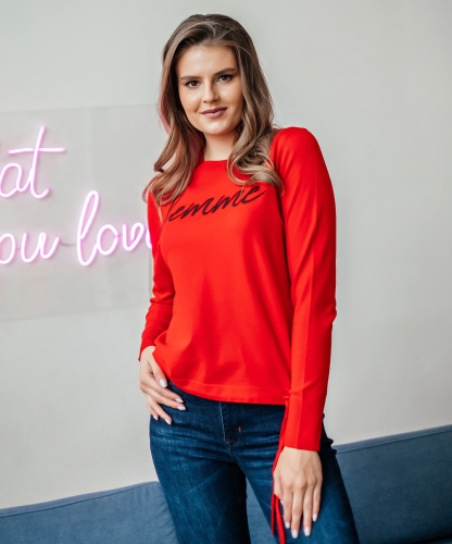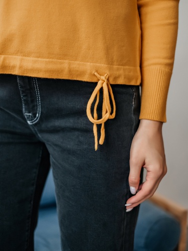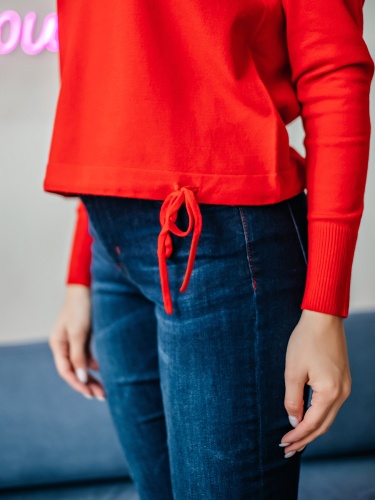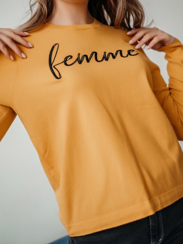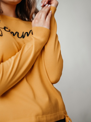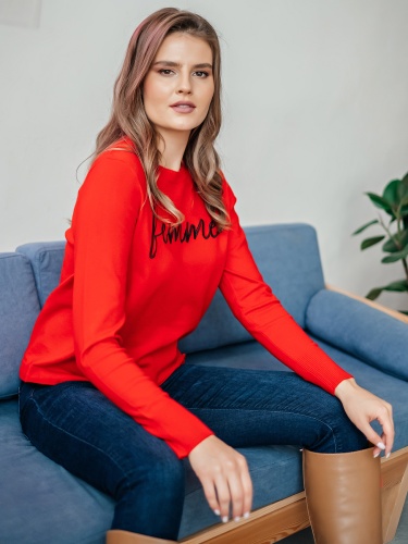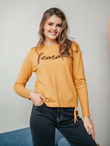 На сайте указаны российские размеры Ткань: смесовая ткань средней плотности. В составе: 9% шерсть, 18% полиакрил, 30% вискоза, 43% полиэстер. Крой: приталенный трикотажный джемпер с круглым вырезом и длинным рукавом. Ворот и манжеты отделаны резинкой, которая с одной стороны – обеспечивает нужное прилегание, с другой – служит украшением изделия. Низ затягивается тонким шнурком в цвет джемпера для регулирования ширины. Представлен в двух стильных оттенках – красном и горчичном. Отделка: лаконичная надпись «femme» позволяет не забывать, что весь мир принадлежит женщинам. Сочетайте с классическими и повседневными брюками из ассортимента Stern.
