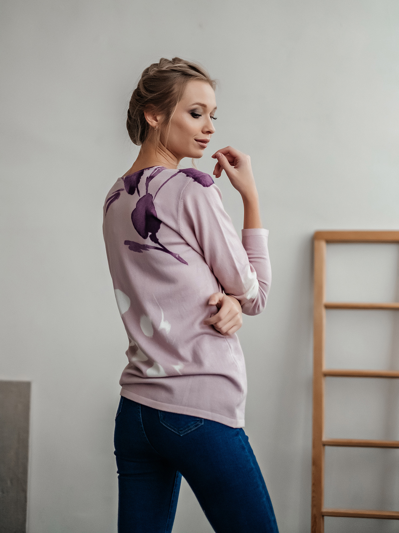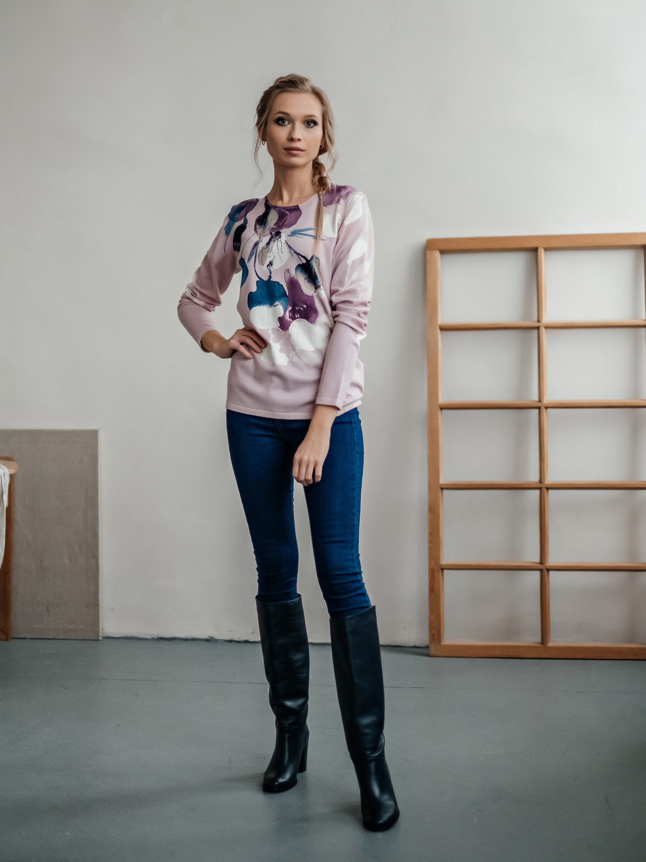 Теплый джемпер обращает на себя внимание благодаря цветочному принту в акварельном стиле. Прямой покрой, круглый вырез горловины, втачные рукава полной длины. Завершает изумительный дизайн декор стразами. Приятный к телу материал из смеси с вискозой и хлопком обеспечивает комфорт.