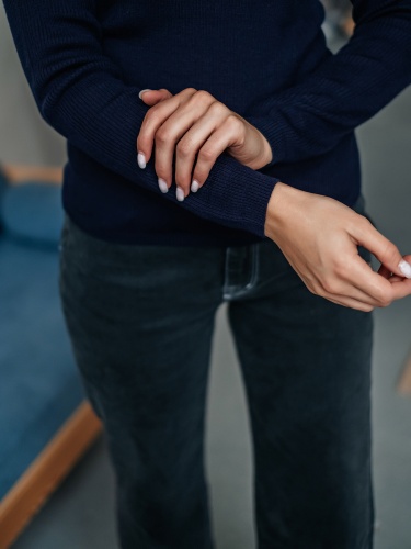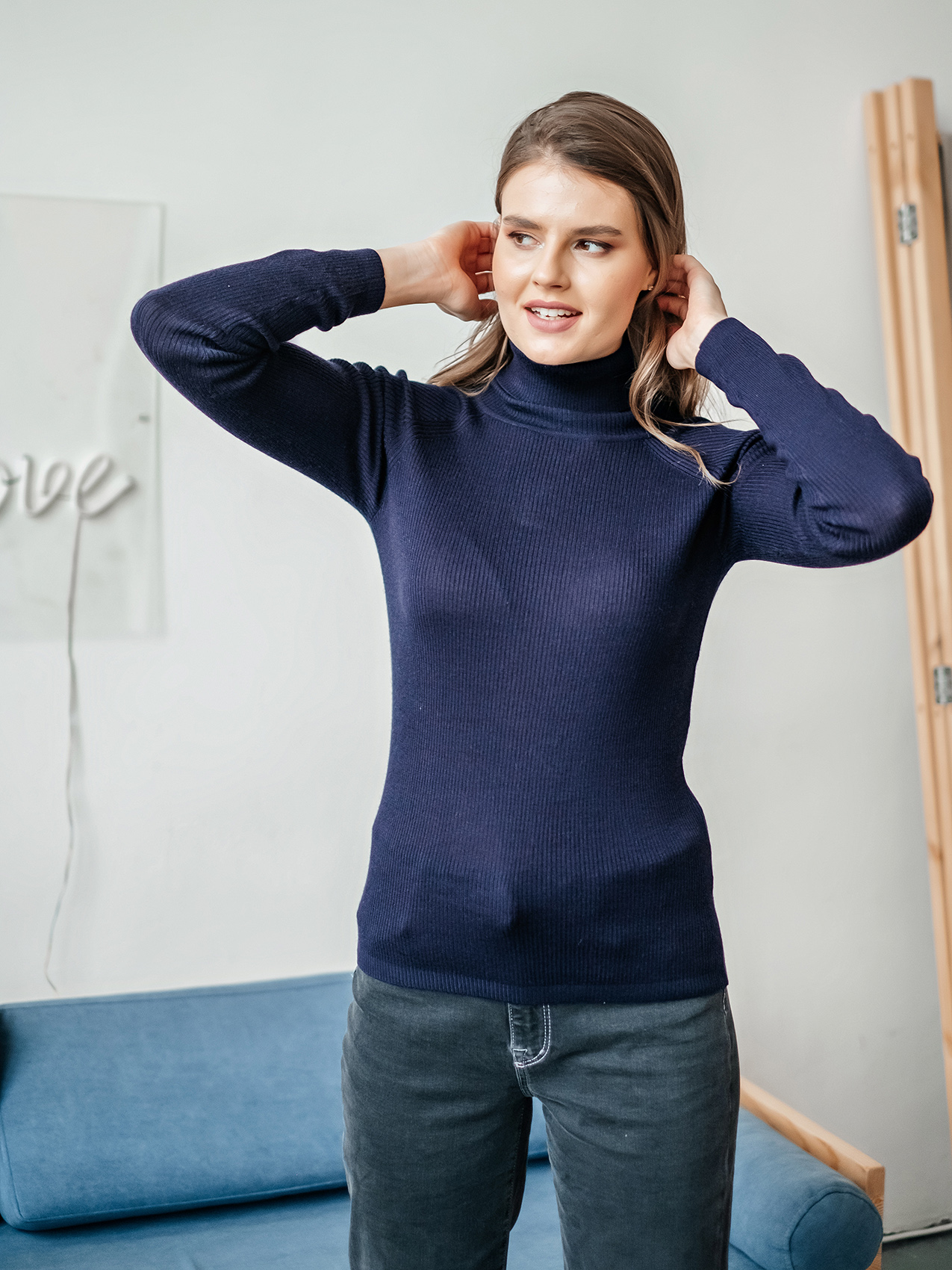 На сайте указаны российские размеры Ткань: смесовая ткань средней плотности. В составе: 45% акрил, 32% тенсель, 23% шерсть. Крой: базовый однотонный джемпер приталенного силуэта в мелкий рубчик. Модель, напоминающая привычную водолазку, выделяется длинным воротом, который защищает от холода и ветра. Универсальная модель с шерстью в составе идеальный вариант для зимы и межсезонья. Джемпер представлен в трех стильных оттенках – сером, бежевом и темно-синем. Отделка: ткань в мелкий рубчик прекрасна в своей простоте. Базовый компаньон для джинсов, брюк, джемперов, сарафанов, юбок и рубашек.