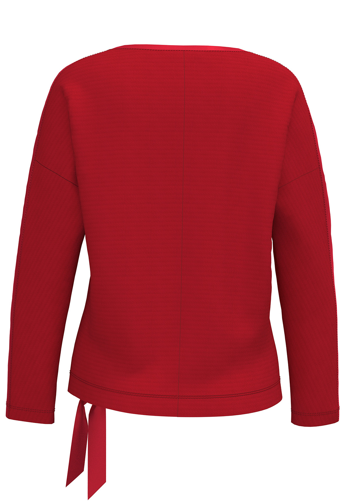 Джемпер в цвете чили - вещь для яркого образа! Прямой покрой. Круглый вырез горловины и рукава полной длины со спущенным плечом отделаны лентой, придающей ненавязчивый блеск. Низ изделия оформлен лентой-бантом. Приятный к телу эластичный материал комфортен в ношении.