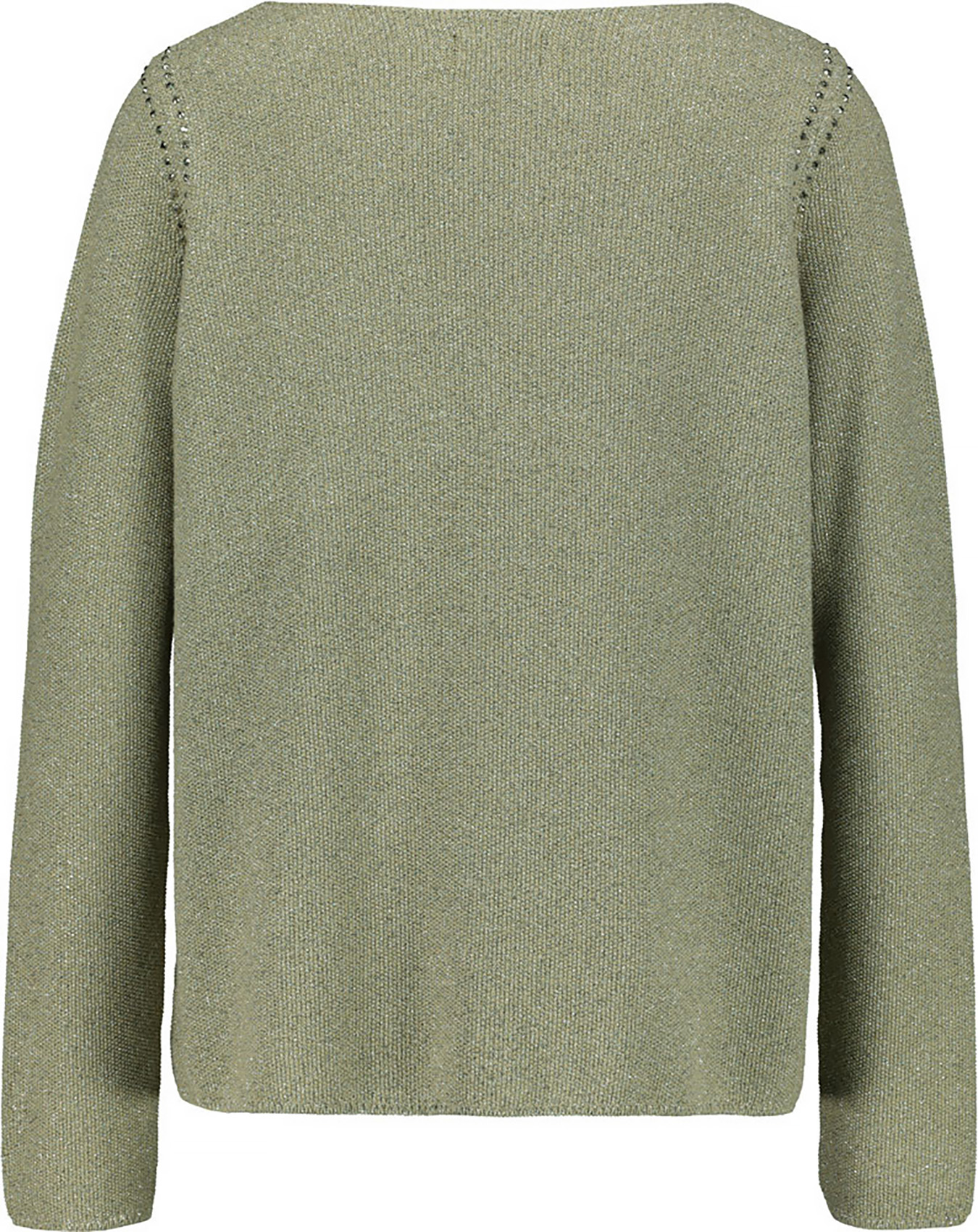 Джемпер прямого кроя трендового оливкового цвета. Широкая овальная горловина, втачной рукав полной длины. Перед и плечи украшают стразы. Небольшой разрез добавляет шарм изделию. Можно сочетать как с юбкой, так и с брюками.