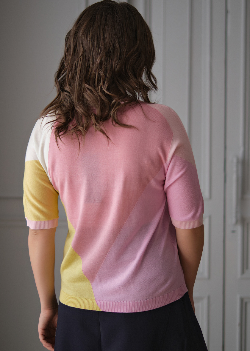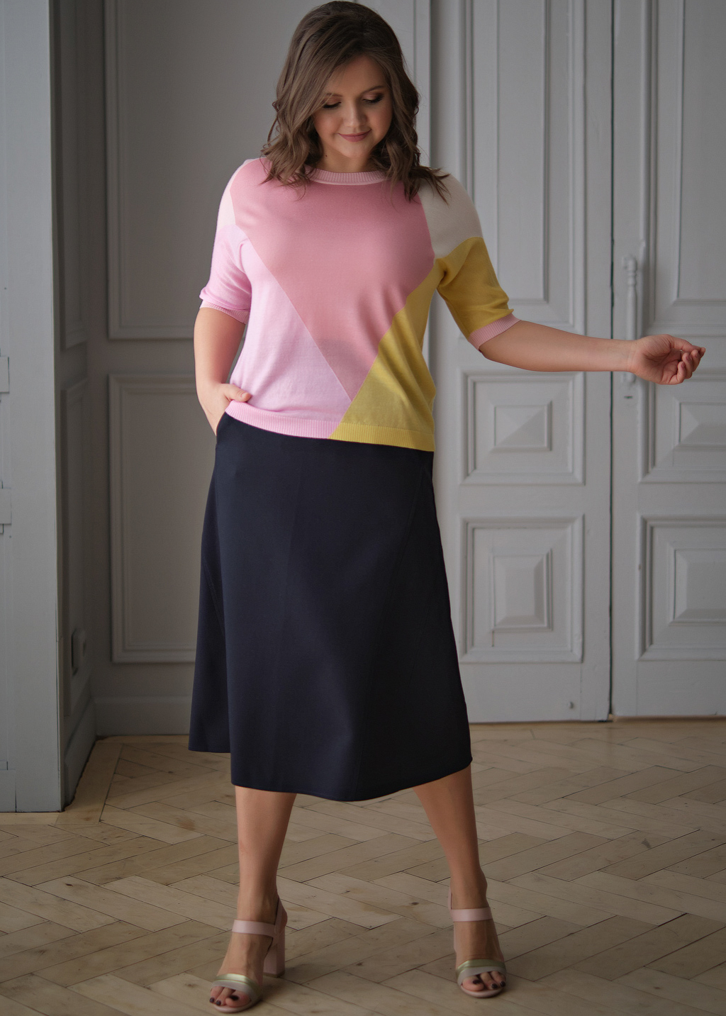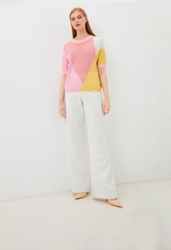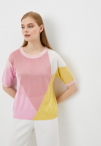 На сайте указаны Российские размеры. Ткань: смесовая ткань средней плотности. В составе: 23% шерсть, 32% тенсел, 45% акрил. Крой: слегка приталенный джемпер с коротким рукавом и круглым вырезом в стиле color blocking. Несмотря на то, что яркая геометрия принта приковывает сотни взглядов, она способна скрыть нюансы фигуры, о которых необязательно знать всем. Короткий комфортный рукав в спортивном стиле – выбор активных женщин, успевающих сделать 100 дел на дню. Отделка: оттенки ягодного зефира и лимонного пудинга не оставляют равнодушных. Рукава, низ и горловина отделаны резинкой, которая не давит, но обеспечивает деликатное прилегание к телу. Создайте нежный образ со свободными светлыми брюками или юбкой из коллекции Stern.