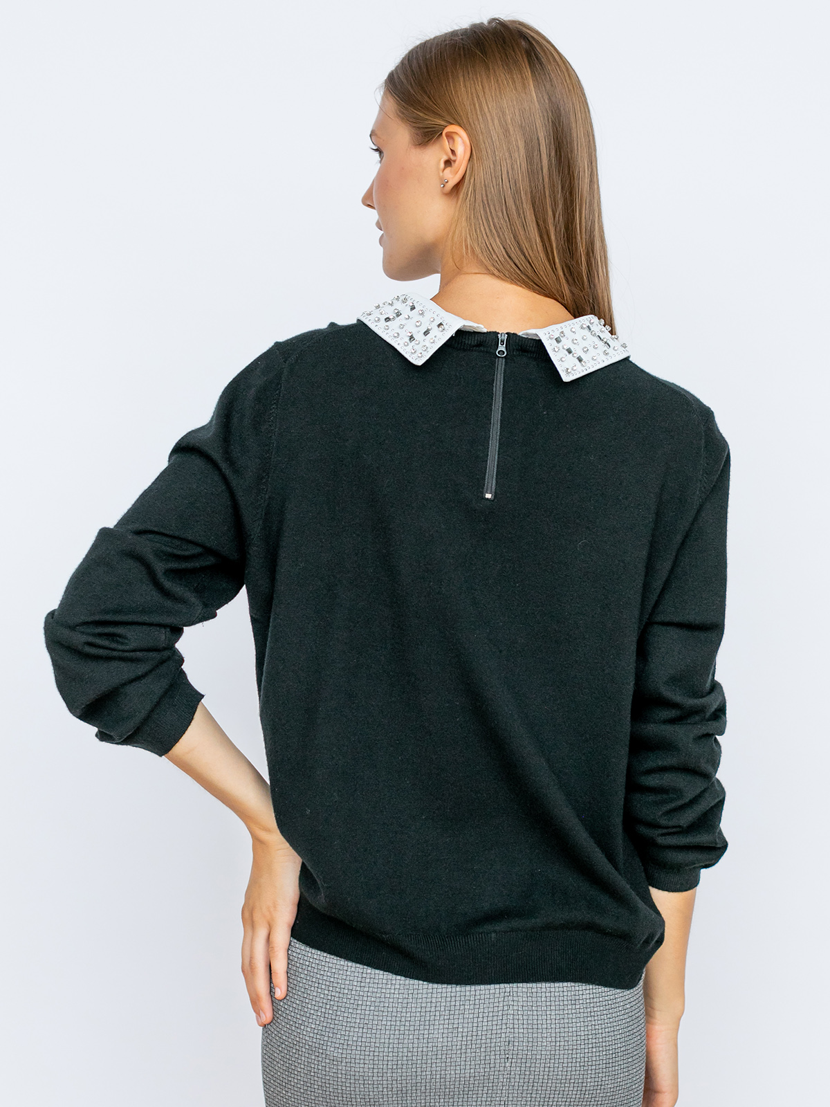 Джемпер с имитацией модели-двойки – элегантный вариант верха для образа в деловом стиле. Свободный крой подходит для фигур разного типа. Длинный втачной рукав с эластичной манжетой. Функциональный акцент в виде замка-молнии на спинке. Белый отложной воротничок декорирован стразами. Джемпер хорошо сочетается как с юбкой, так и с брюками.