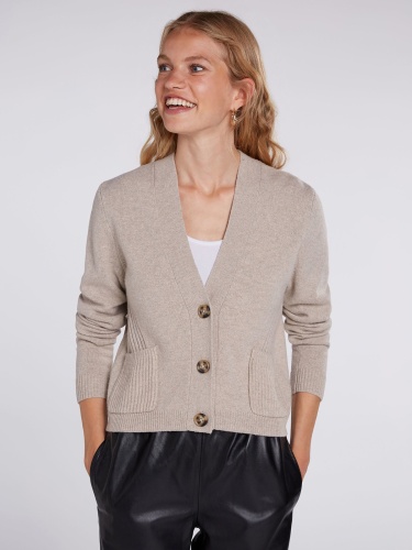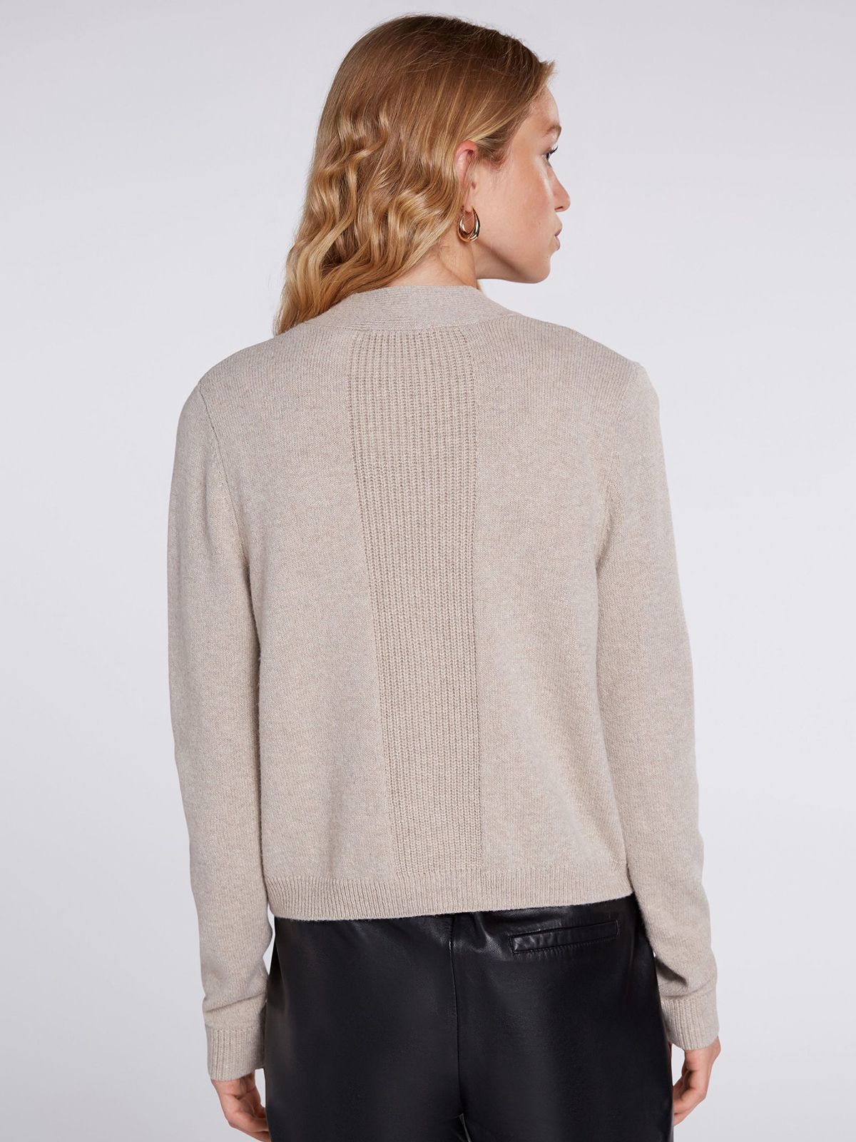 Укороченный кардиган с деталями в рубчик. Женственный V-образный вырез, планка с тремя пуговицами. Два практичных накладных кармана. Длинные втачные рукава. Длина 50 см для размера 42. Рост модели 178 см, ее размер – 42 (российский).