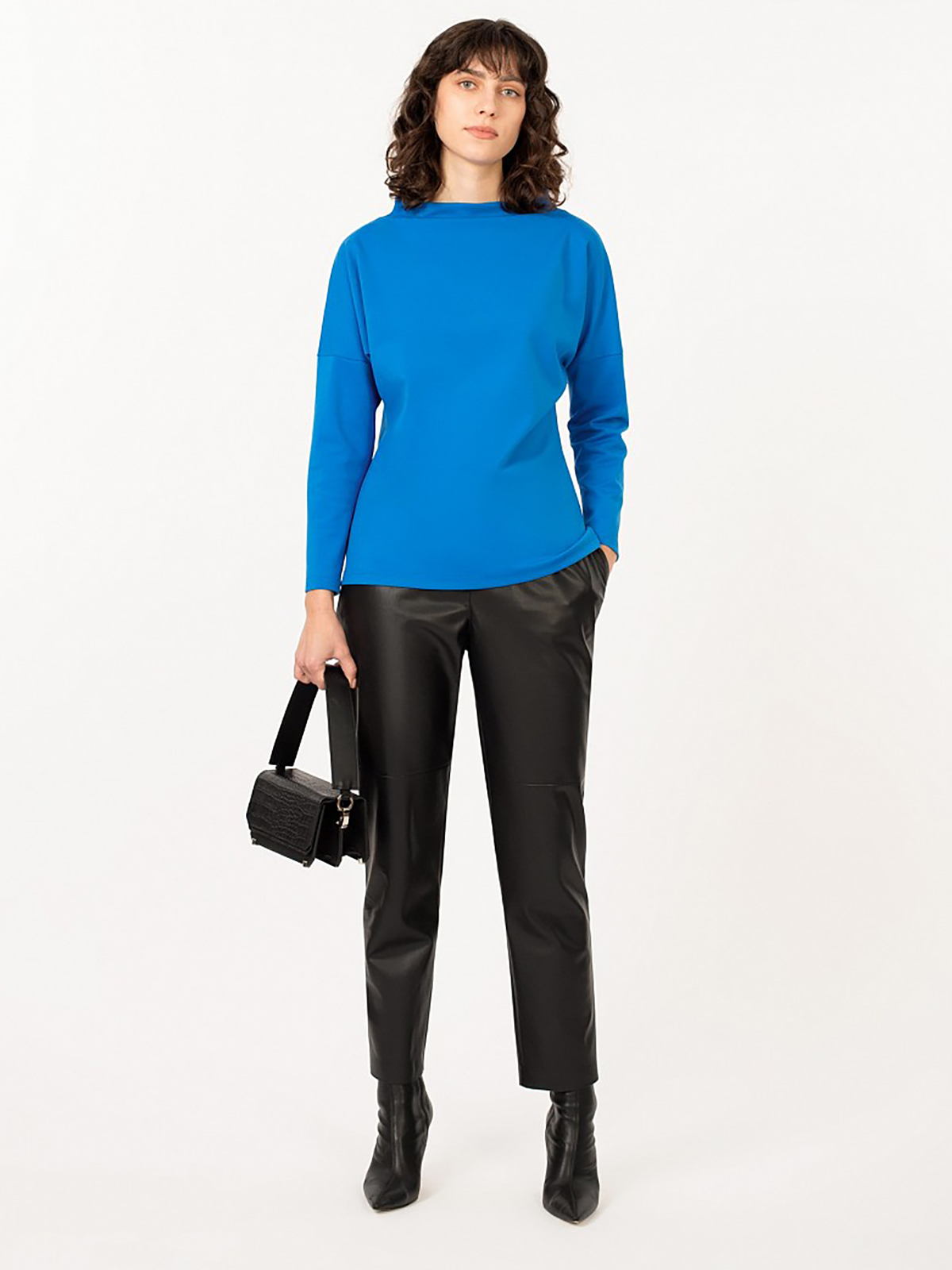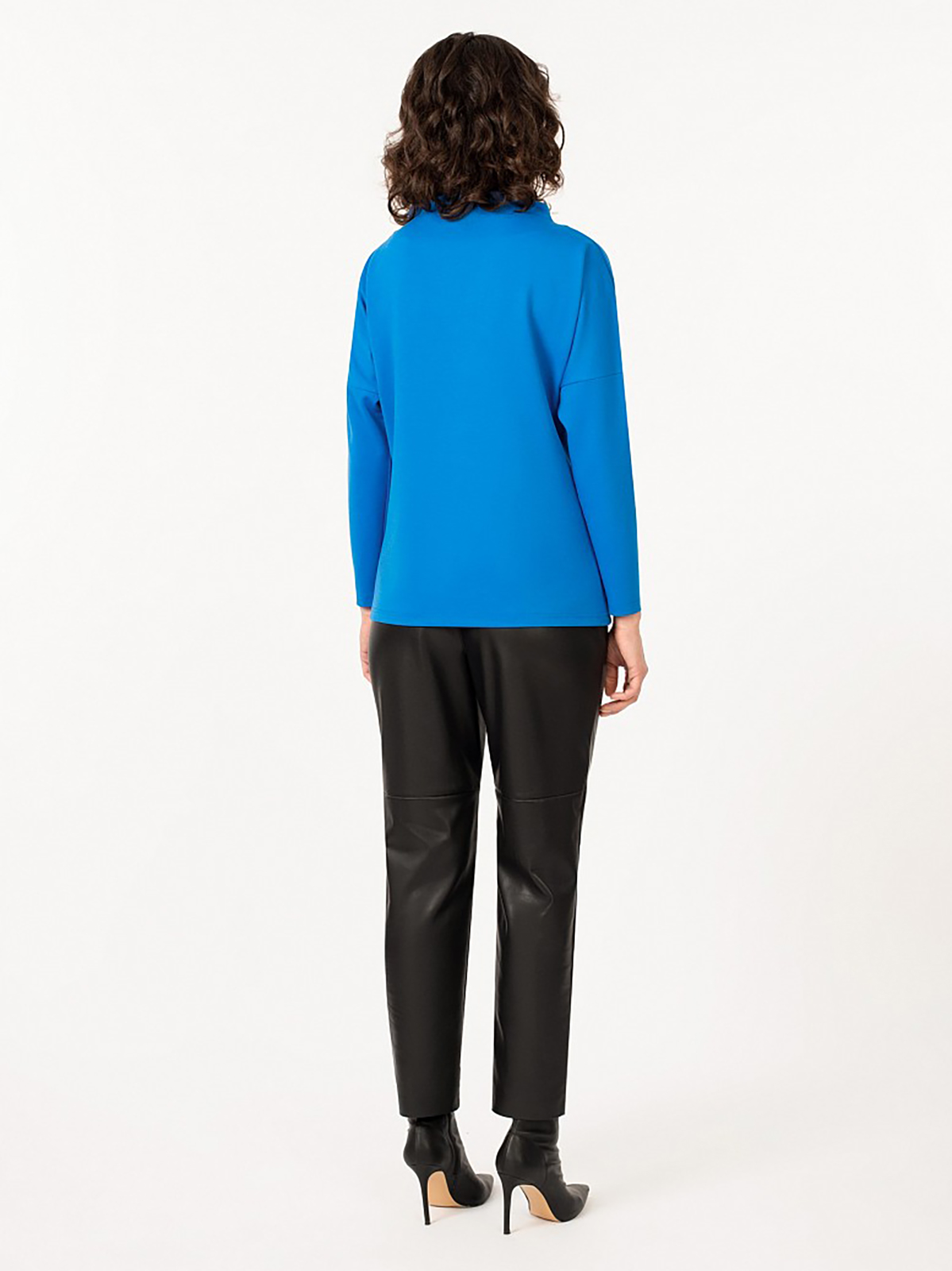 Насыщенный синий оттенок – бесспорный тренд сезона. Джемпер прямого кроя со спущенной линией плеч идеально впишется в образ в повседневном городском стиле. Вырез горловины лодочка. Материал приятен к телу и комфортен в ношении.
