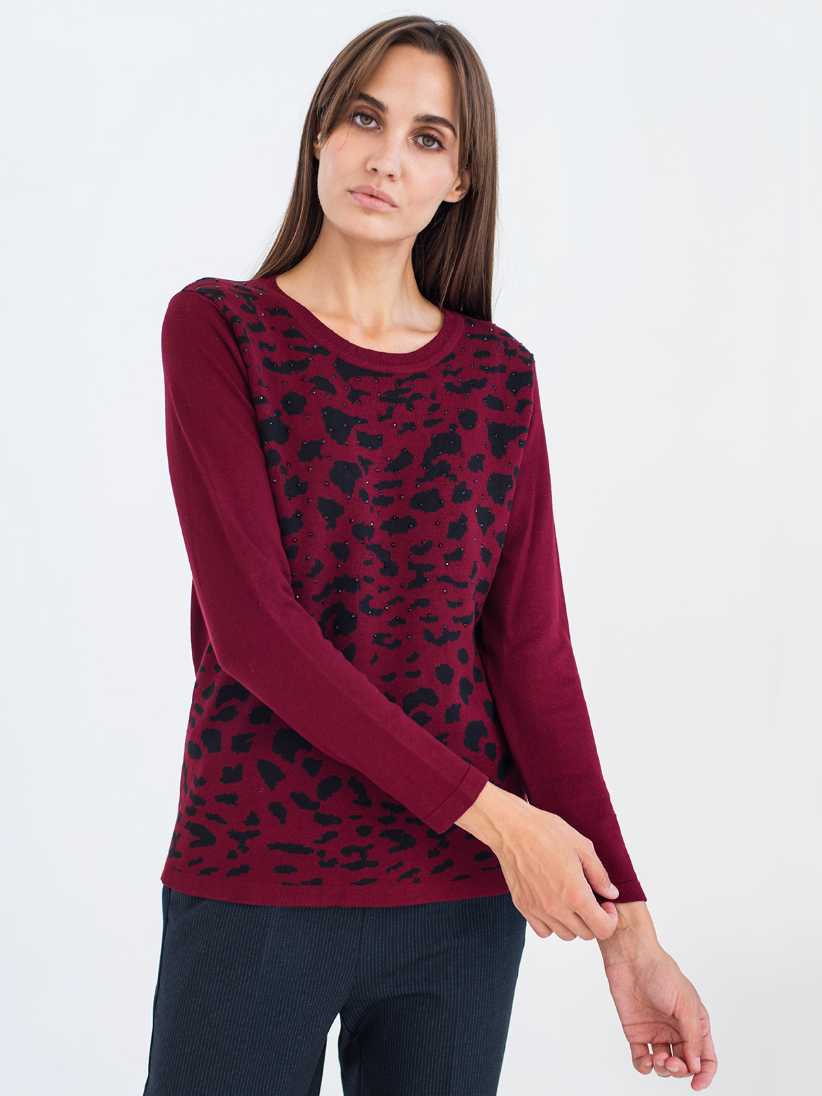 На сайте указаны Российские размеры. Анималистичный принт – бесспорный тренд этого сезона! Джемпер в насыщенном бордовом оттенке с леопардовым узором украшен стразами. Овальный вырез горловины подчеркивает изящество линии шеи. Прямой крой прекрасно подходит к разному типу фигуры. Джемпер хорошо сочетается как с брюками, так и с юбкой.