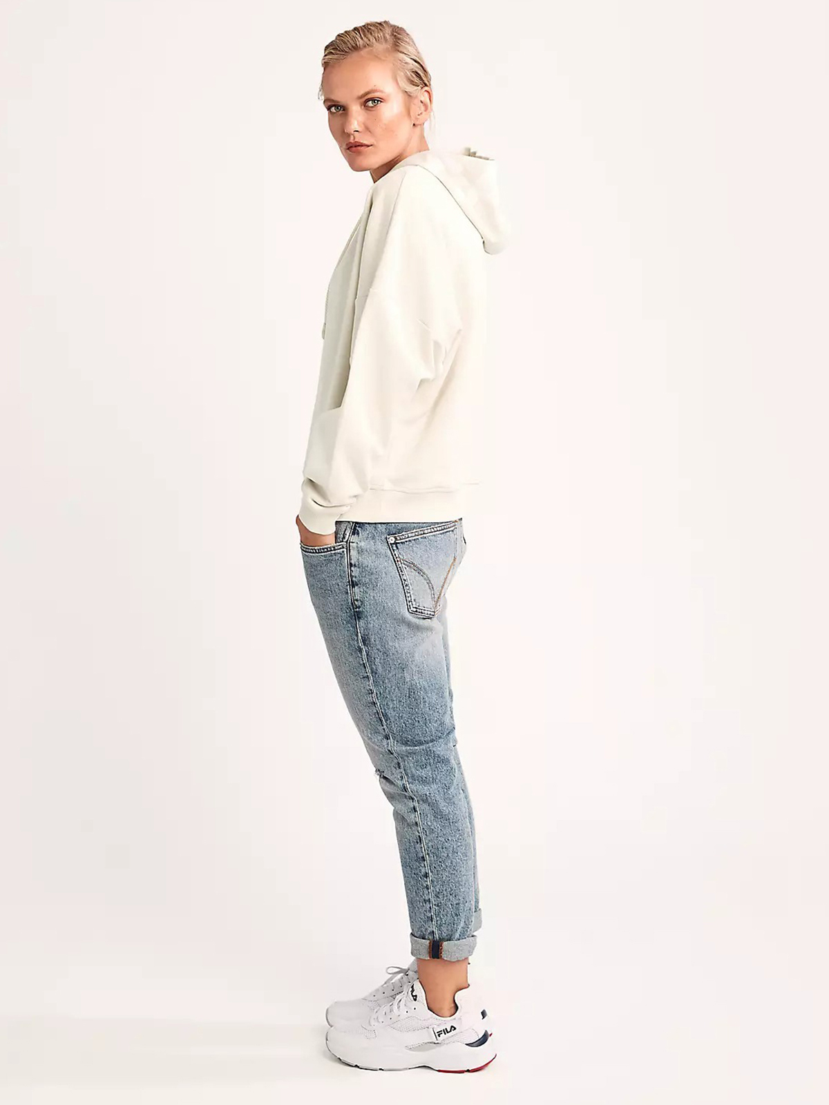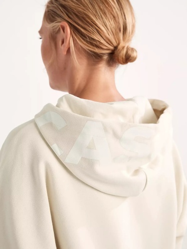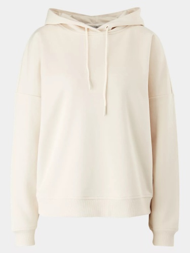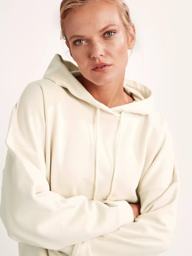 Базовая бежевая толстовка для повседневных образов в городском и спортивном стиле. Свободный силуэт и спущенная линия плеч придают расслабленную небрежность образу. Глубокий капюшон с кулиской украшен принтом –надписью в тон изделия.