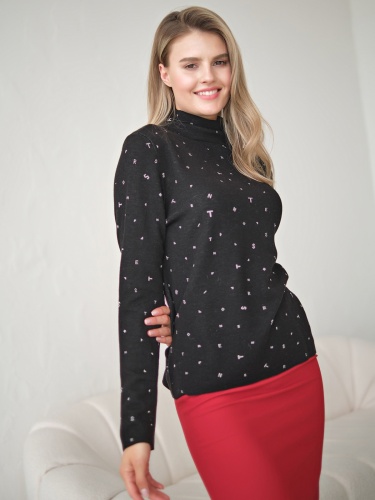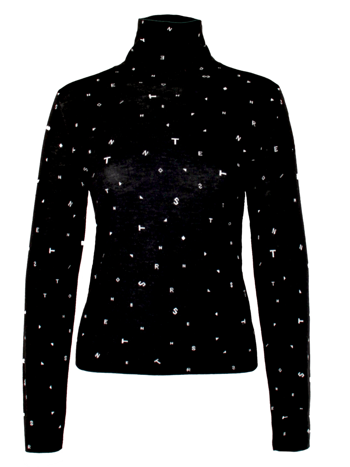 Базовая черная водолаза с текстовым узором по всей поверхности. Воротник-гольф, длинный втачной рукав. Полуприталенный силуэт подчеркивает фигуру. Джемпер может выступать в качестве самостоятельного верха или надеваться под жакет или блейзер.