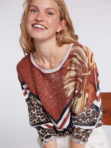 Джемпер свободного силуэта с анималистичным дизайном. Широкий овальный вырез горловины, спущенная линия плеч. Длина 62 см для 42 российского размера. Рост модели 178 см, ее размер - 42.