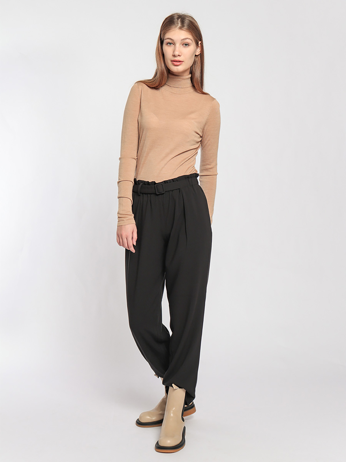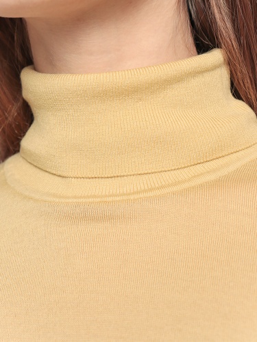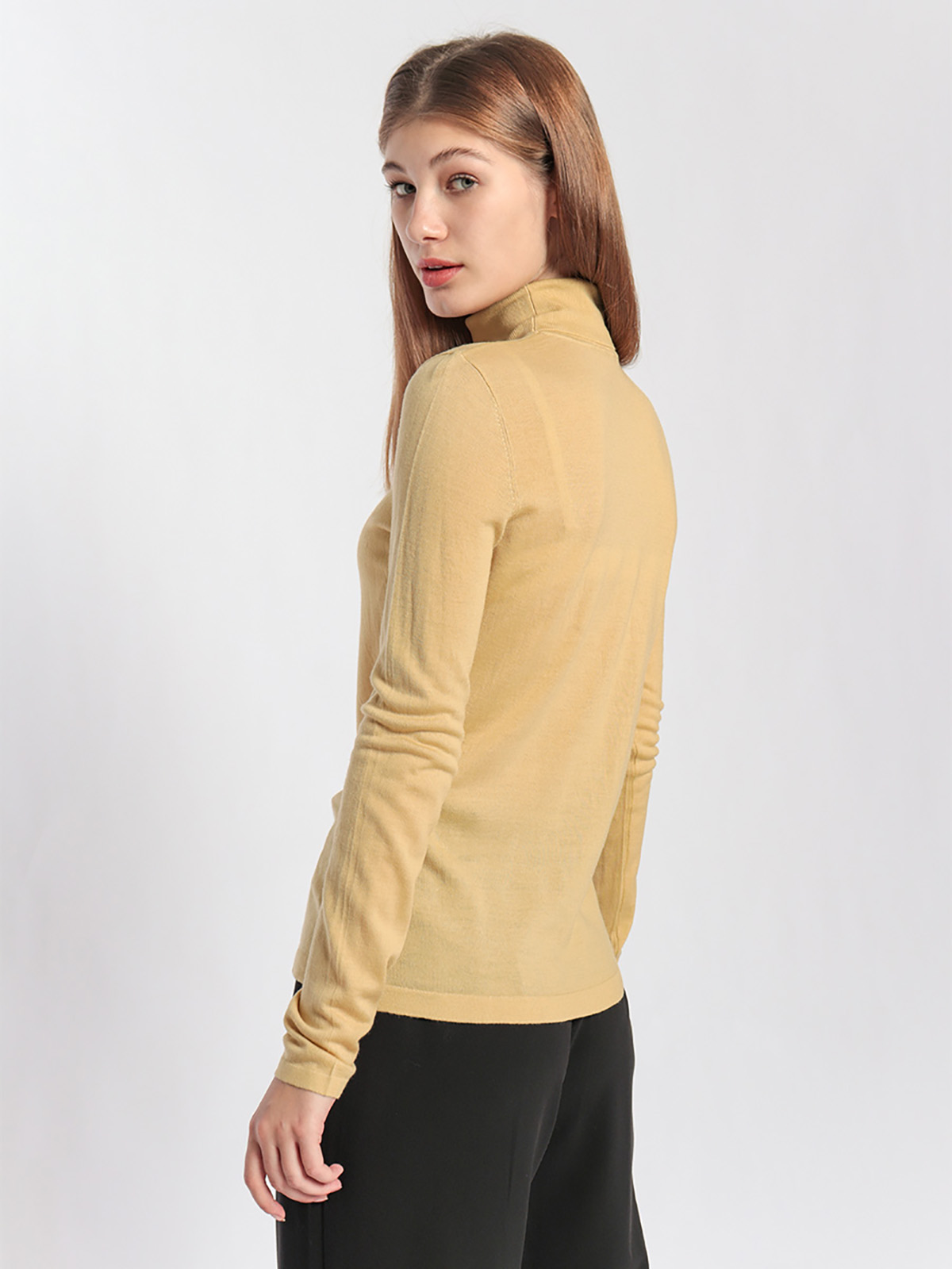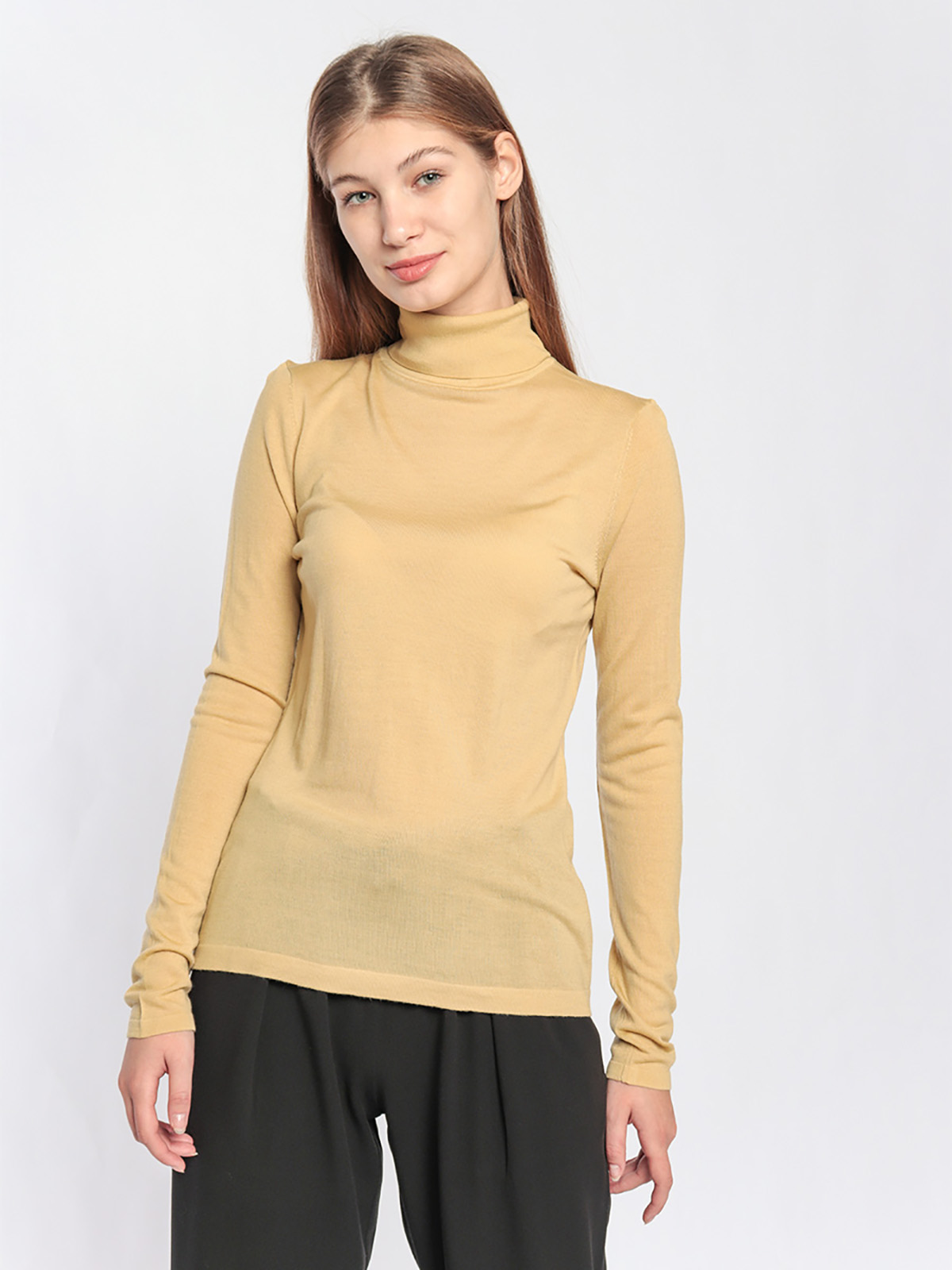 Однотонная базовая водолазка идеально подойдет для многослойных образов. Материал из 100% шерсти приятен к телу и хорошо сохраняет тепло. Приталенный силуэт, воротник-гольф, длинные втачные рукава.