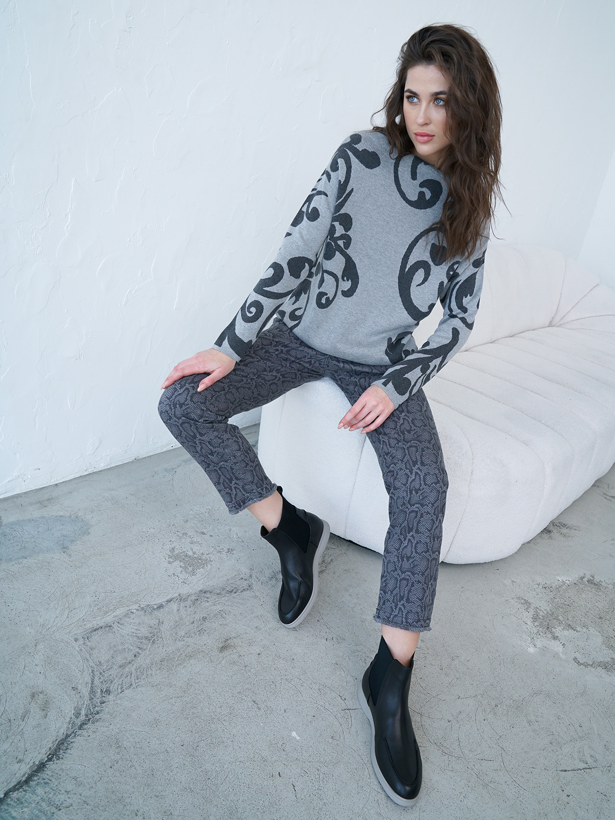 Джемпер прямого кроя с ажурным узором. Вырез горловины лодочка, втачные рукава, спущенная линия плеча.