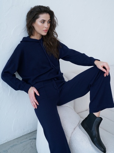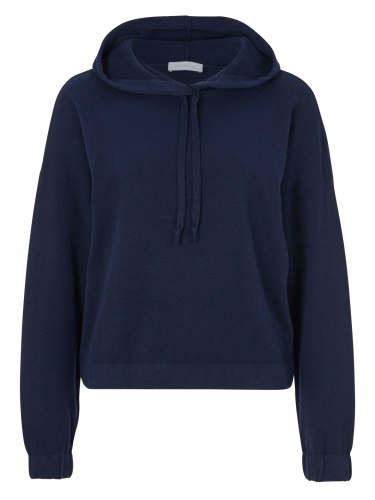 Однотонная толстовка в насыщенно-чернильном оттенке. Капюшон на кулиске, длинные втачные рукава с манжетами.