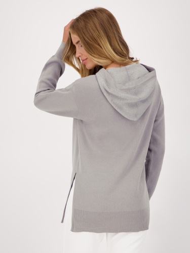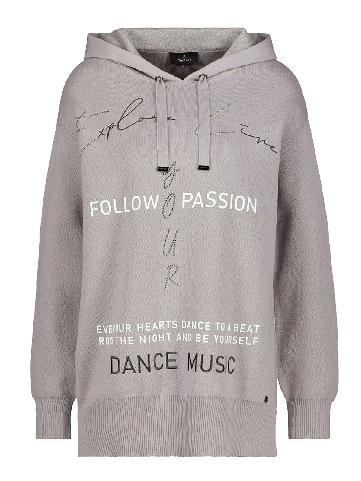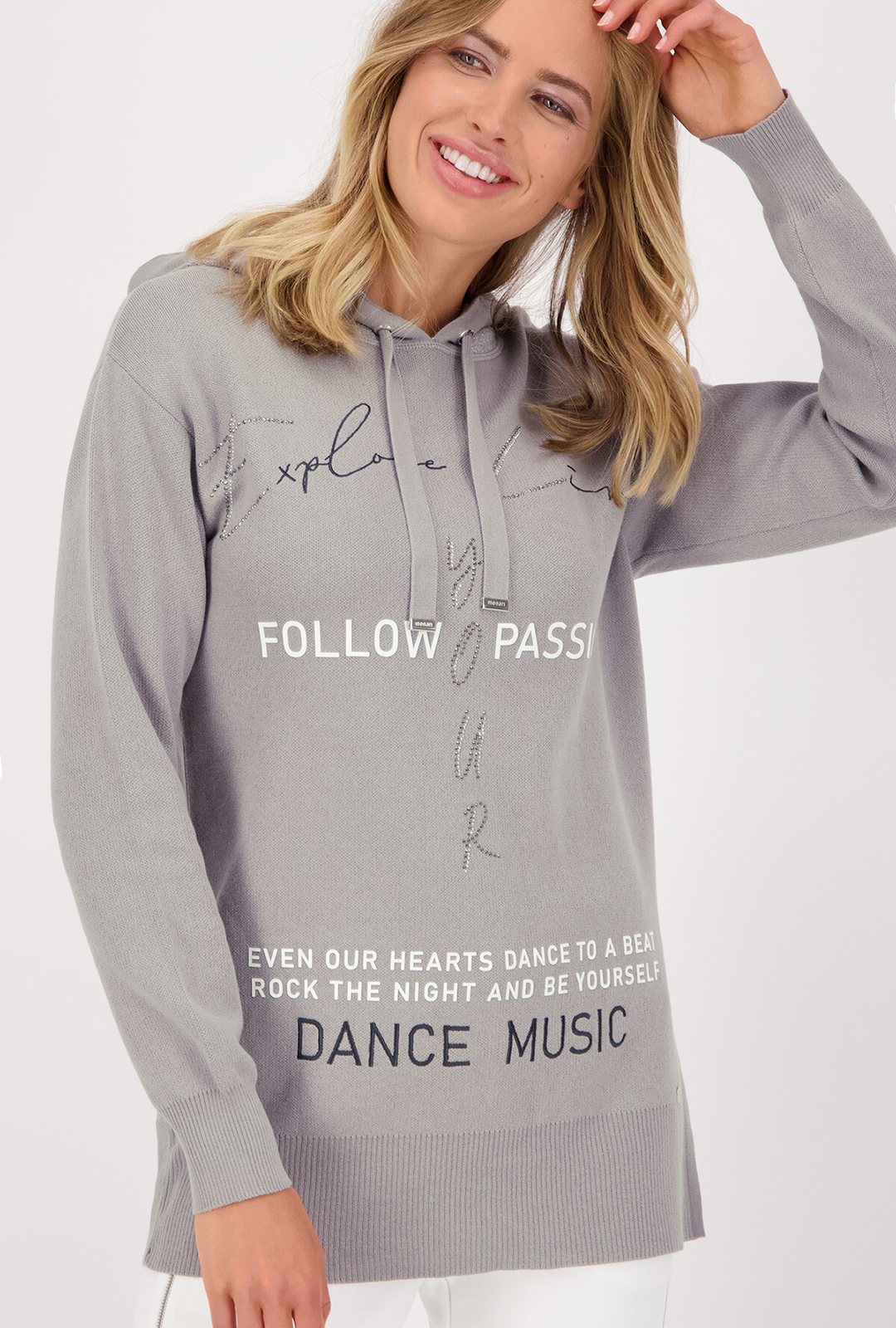 Однотонная толстовка прямого кроя в сером оттенке с принтом. Капюшон с кулиской и шнурком в тон изделия. Спущенная линия плеч, длинные втачные рукава с трикотажными эластичными манжетами. Широкая резинка в рубчик по низу изделия.
