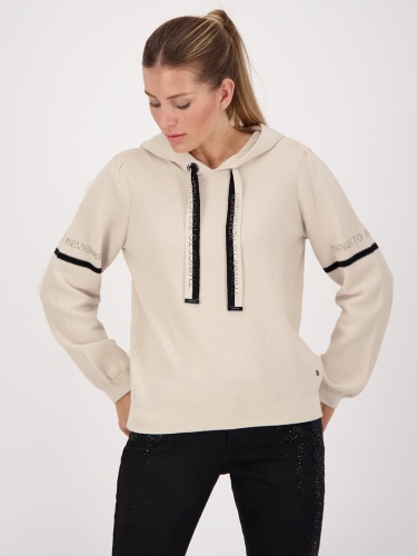 Однотонная толстовка прямого кроя в базовом бежевом оттенке. Капюшон с кулиской и контрастным шнурком. Длинные втачные рукава с трикотажными эластичными манжетами. Акцентные детали в виде контрастных полос на рукавах.