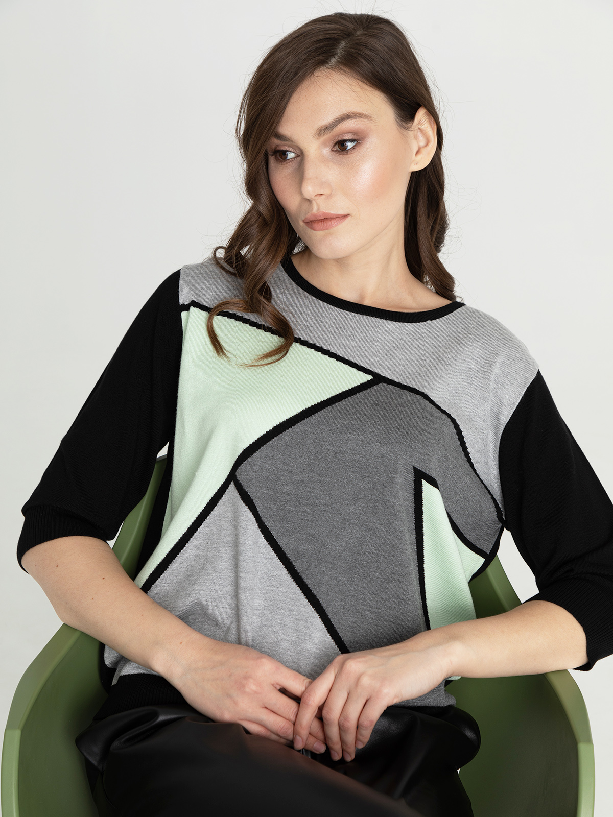 Джемпер в стиле пэчворк. Базовая цветовая гамма, прямой силуэт. Однотонные черные рукава длиной 3/4. Овальный вырез горловины обрамлен черной бейкой.