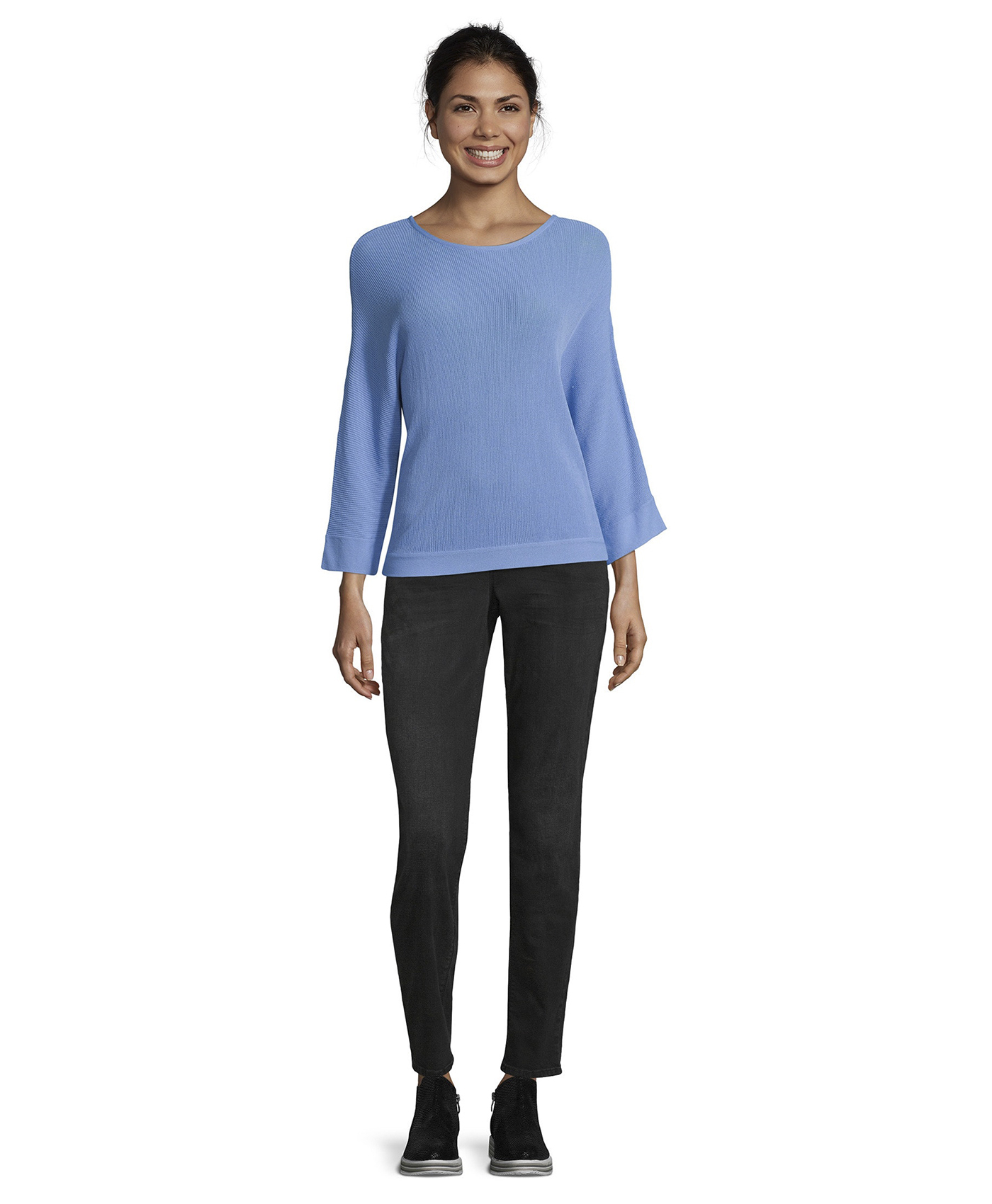 Джемпер машинной вязки обязательно должен присутствовать в любом гардеробе. Слегка приталенный силуэт, круглый вырез горловины, цельнокроеные рукава 3/4. Приятный к телу материал из вискозной смеси. Этот джемпер отлично дополняет женственный образ.