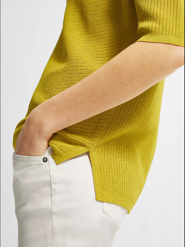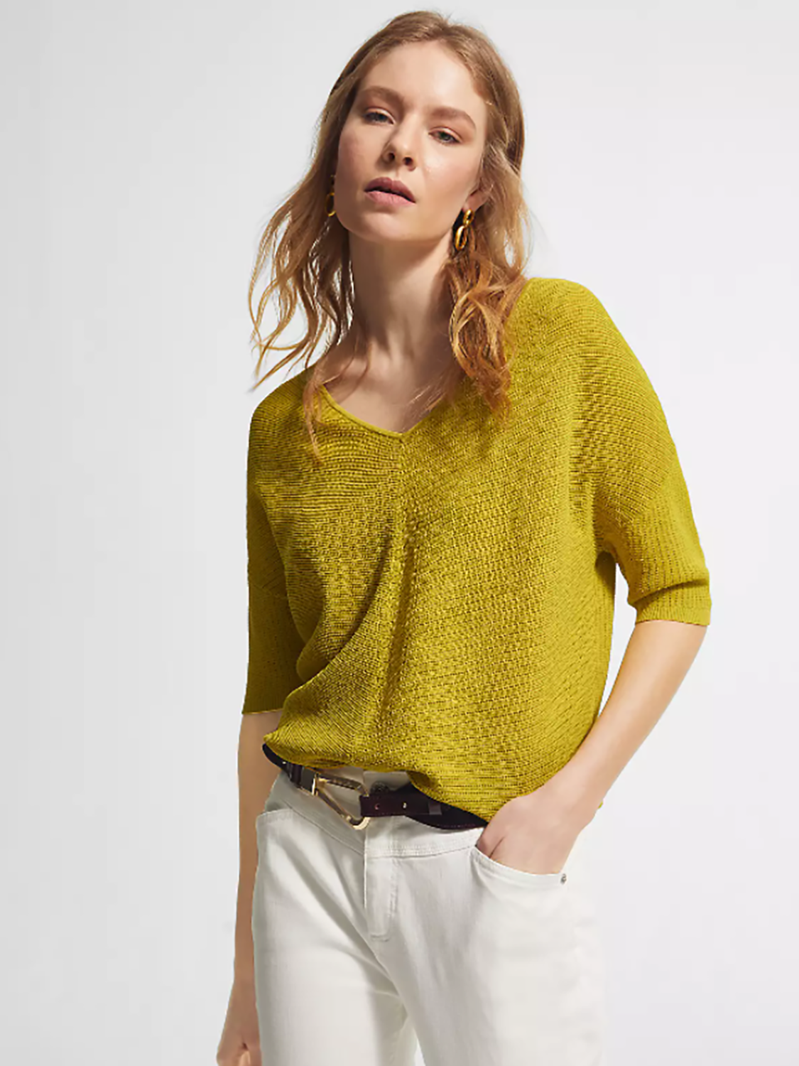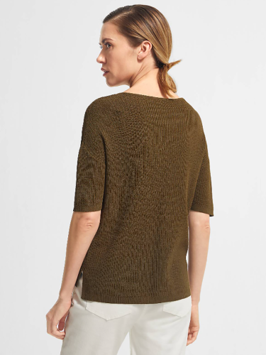 Однотонный джемпер мелкой вязки с глубоким V-образным вырезом горловины. Спущенная линия плеч, втачной рукав длиной до середины локтя. Свободный силуэт, невысокие вырезы по бокам.