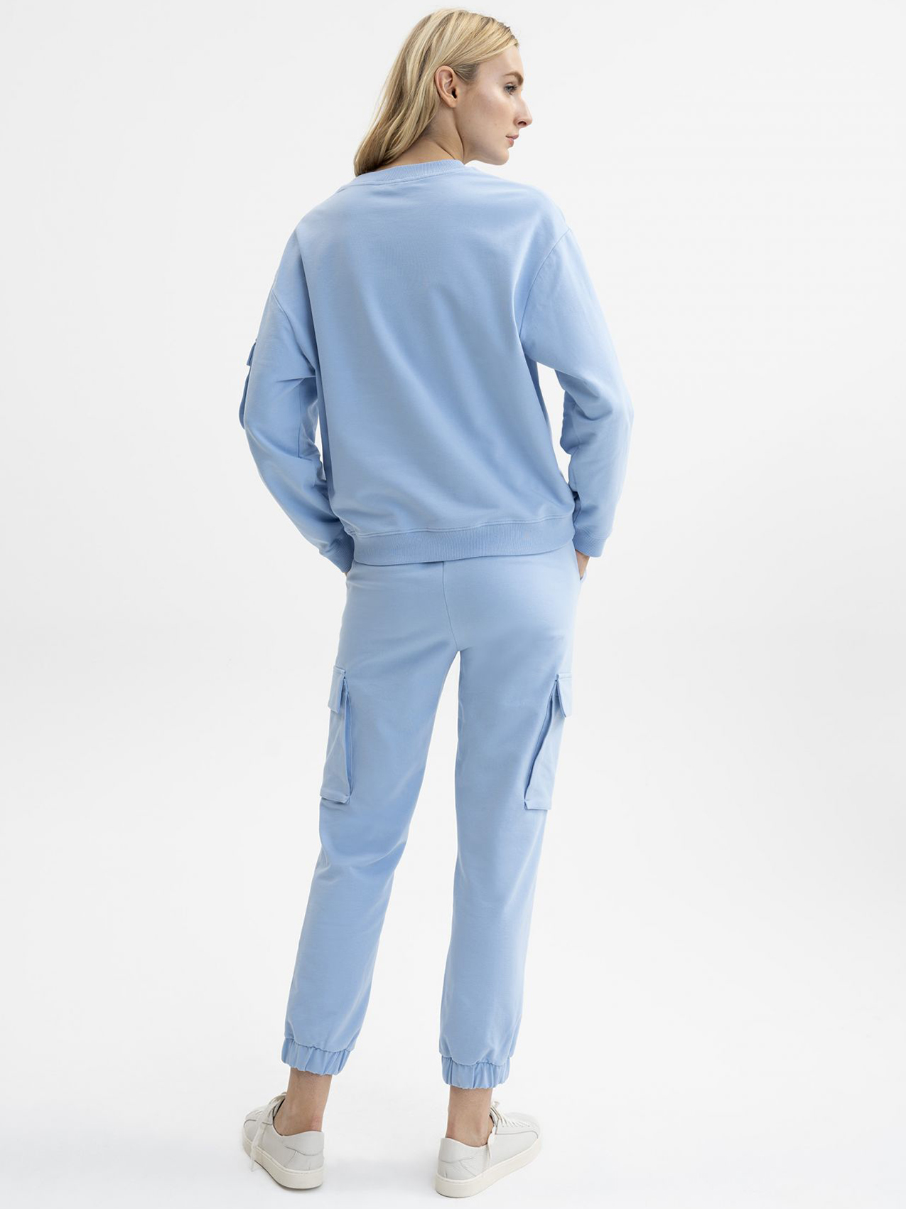 Оригинальный однотонный свитшот с тремя ассиметричными накладными карманами. Втачной рукав полной длины со спущенной линией плеч. Круглый вырез горловины, эластичный пояс по низу изделия.
