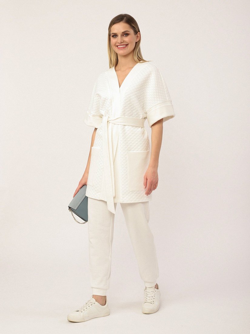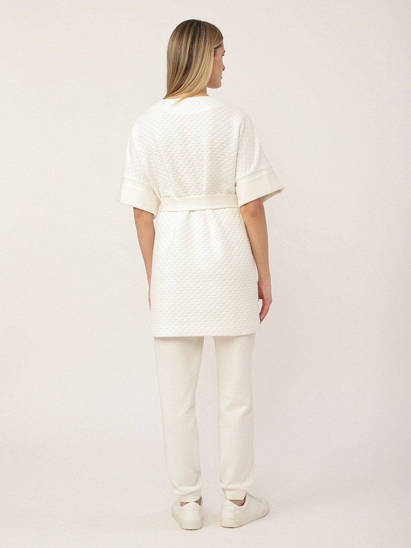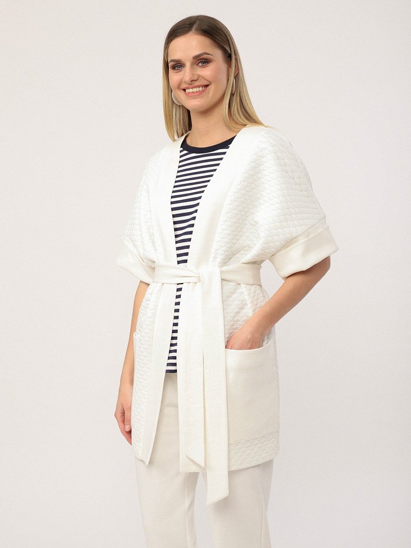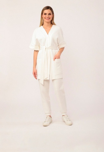 Жилет прямого силуэта из фактурного трикотажа для нежного образа. Акцент на талии за счет пояса в тон изделия. Укороченные рукава-кимоно с широким манжетом. По краю борта идет лента переходящая в горловину.