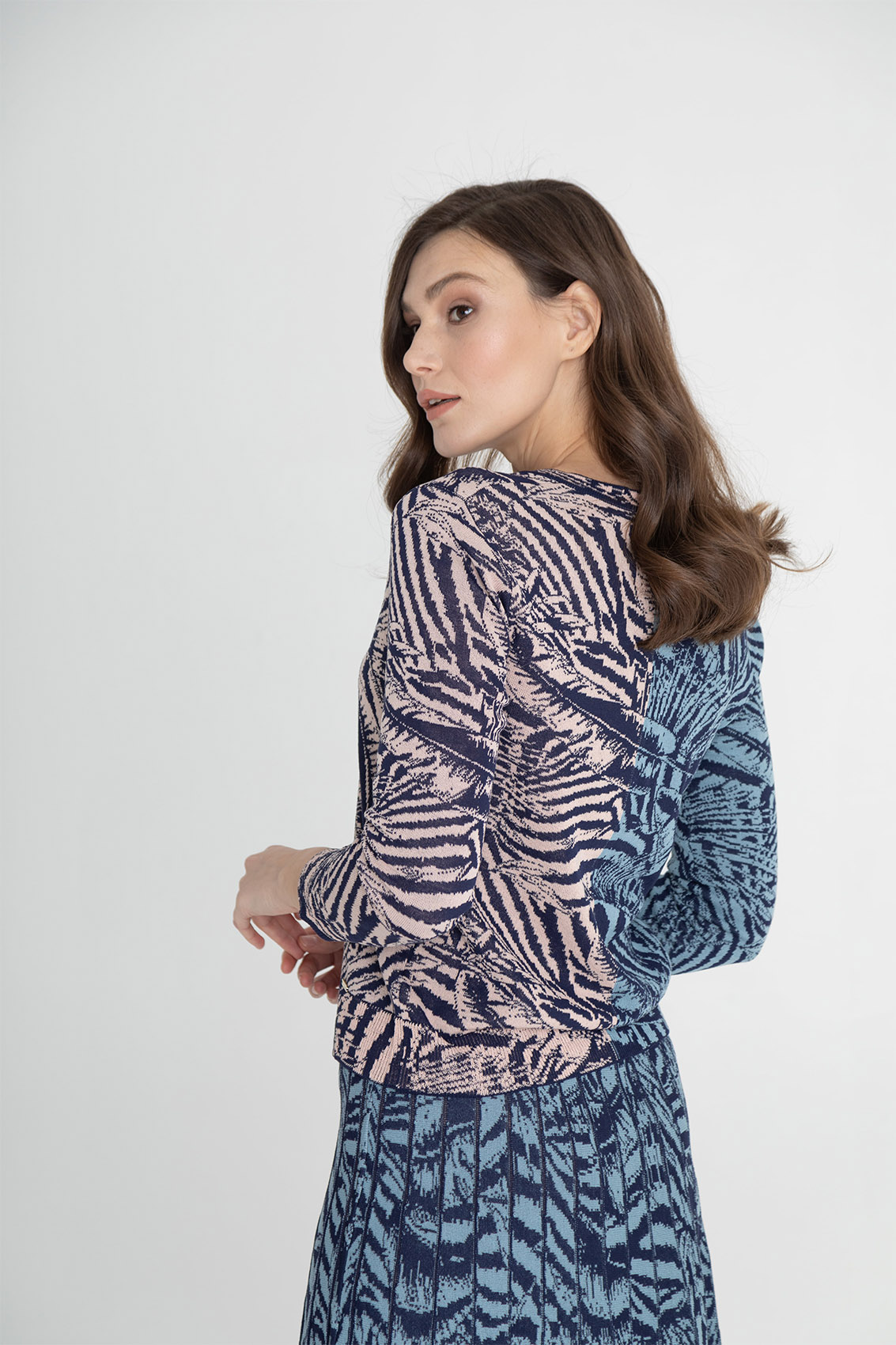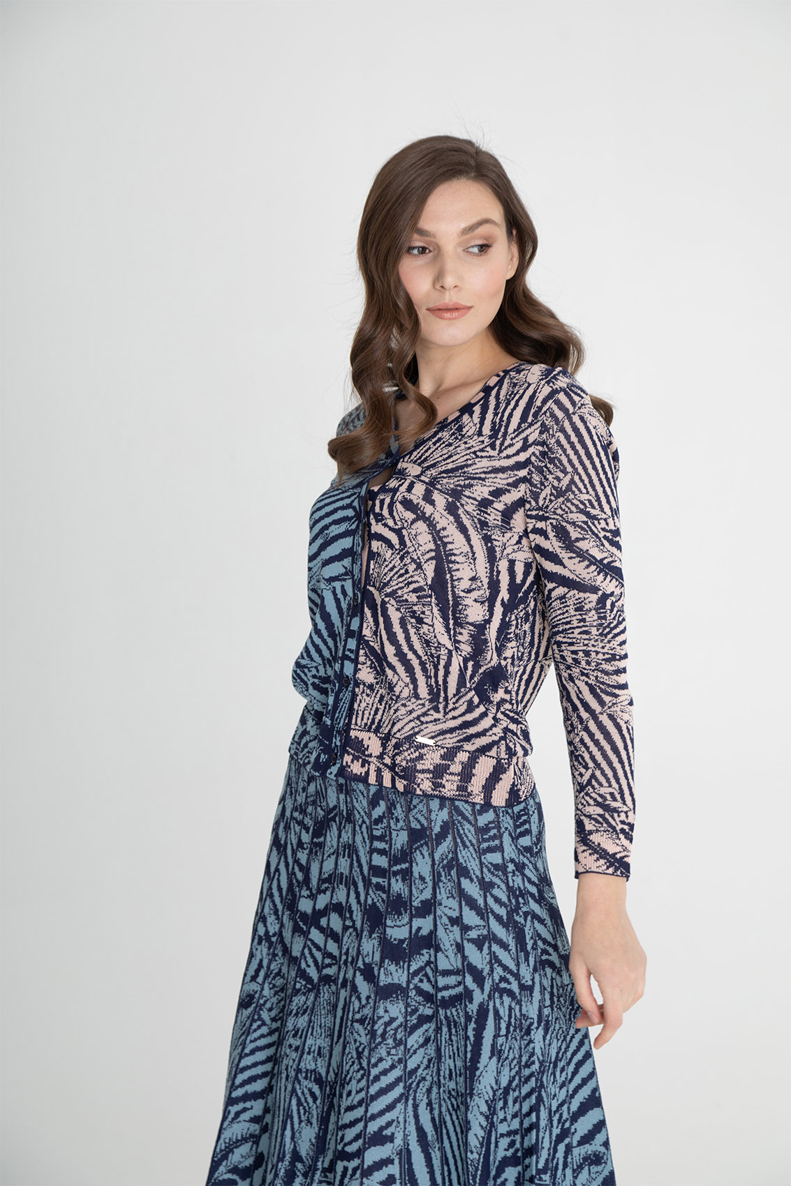 На сайте указаны российские размеры. Ткань: 89% вискоза, 11% нейлон. Крой: джемпер-кардиган вязаный на пуговицах и V-образным неглубоким вырезом. Красиво подчеркивает талию и линию шеи. Активный сложный принт позволяет скрыть недостатки фигуры и показать во всей красоте сильные ее стороны. Отделка: украшен фирменным металлическим шильдиком. В разделе юбок вы найдете юбку аналогичной расцветки, с которой можно составить полноценный комплект.