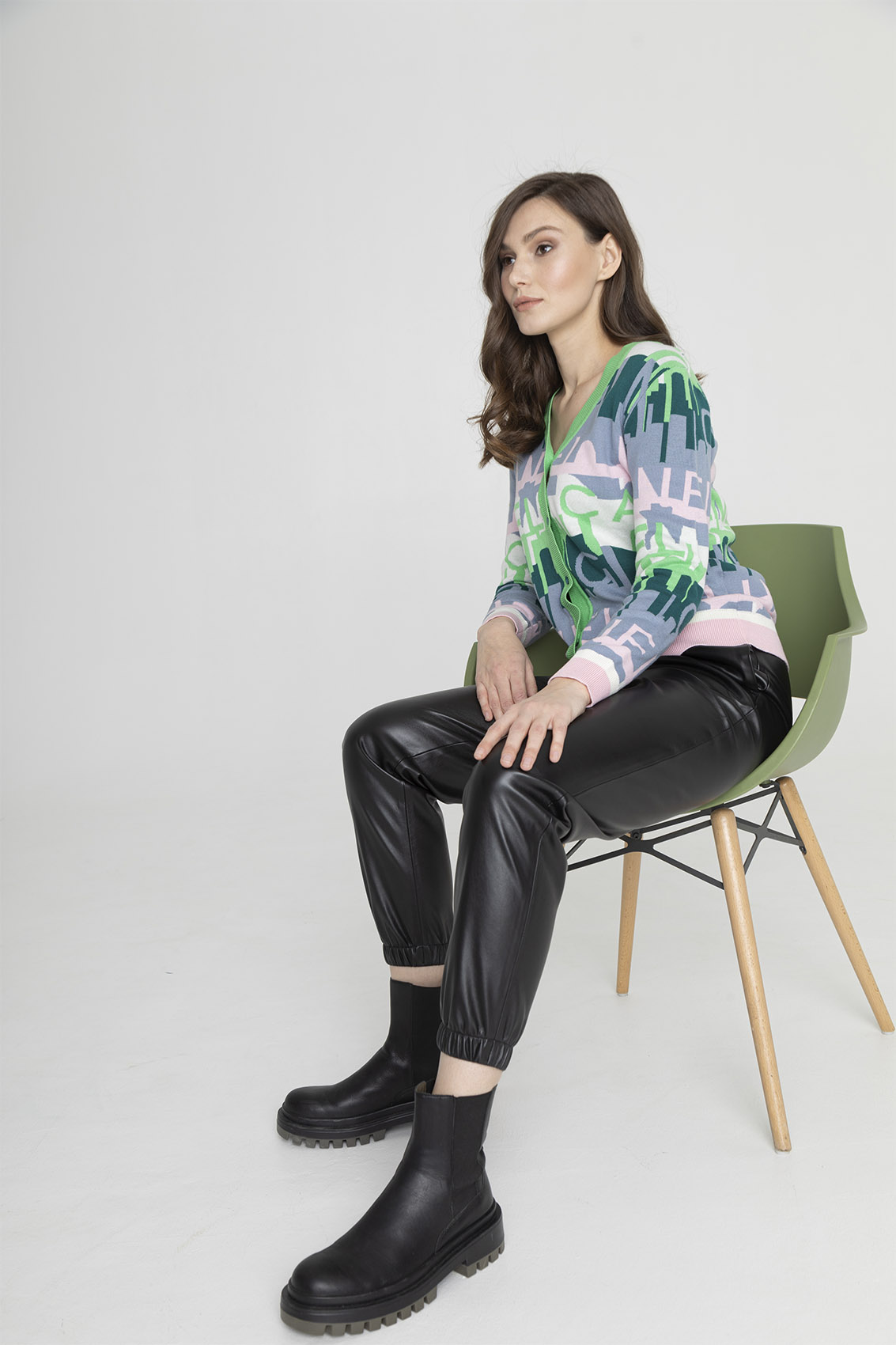 На сайте указаны российские размеры. Ткань: кардиган гладкий трикотажный из хлопка и акрила. Крой: слегка приталенный уютный кардиган с V-образным вырезом идеально садится по фигуре и подчеркивает ее достоинства. Длинный рукав с манжетом-резинкой можно подворачивать до желаемого уровня. Средняя длина надежно скрывает область живота, а вязка-резинка в нижней части изделия не позволяет ему подниматься при ходьбе и движении. Отделка: яркий принт с буквами создает особое настроение. Планка с контрастными пуговицами повторяет фактуру манжетов и низа изделия, что добавляет гармонии всему образу. Украшен фирменной металлической эмблемой-шильдиком в передней нижней части. К яркому верху лучше подбирать более спокойный однотонный низ из коллекции одежды Stern.