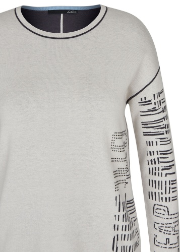 Трикотажный джемпер с буквенным принтом. Втачной рукав полной длины со спущенной линией плеча. Декоративные контрастные строчки на спинке и рукавах изделия. Овальный вырез горловины.